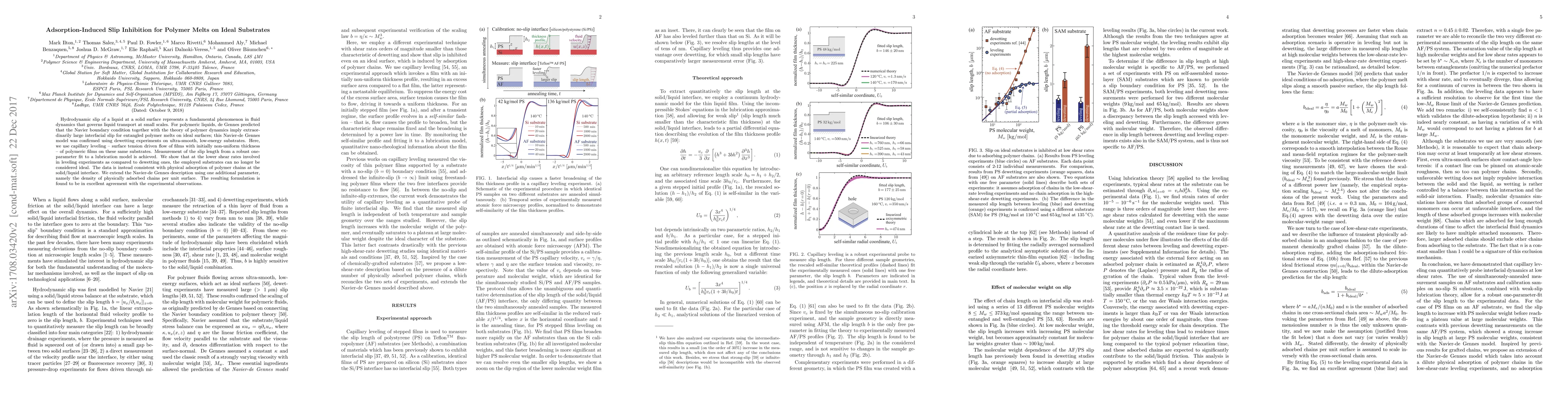 Hydrodynamic slip of a liquid at a solid surface represents a fundamental phenomenon in fluid dynamics that governs liquid transport at small scales. For polymeric liquids, de Gennes predicted that the Navier boundary condition together with the theory of polymer dynamics imply extraordinarily large interfacial slip for entangled polymer melts on ideal surfaces; this Navier-de Gennes model was confirmed using dewetting experiments on ultra-smooth, low-energy substrates. Here, we use capillary leveling - surface tension driven flow of films with initially non-uniform thickness - of polymeric films on these same substrates. Measurement of the slip length from a robust one-parameter fit to a lubrication model is achieved. We show that at the lower shear rates involved in leveling experiments as compared to dewetting ones, the employed substrates can no longer be considered ideal. The data is instead consistent with physical adsorption of polymer chains at the solid/liquid interface. We extend the Navier-de Gennes description using one additional parameter, namely the density of physically adsorbed chains per unit surface. The resulting formulation is found to be in excellent agreement with the experimental observations.