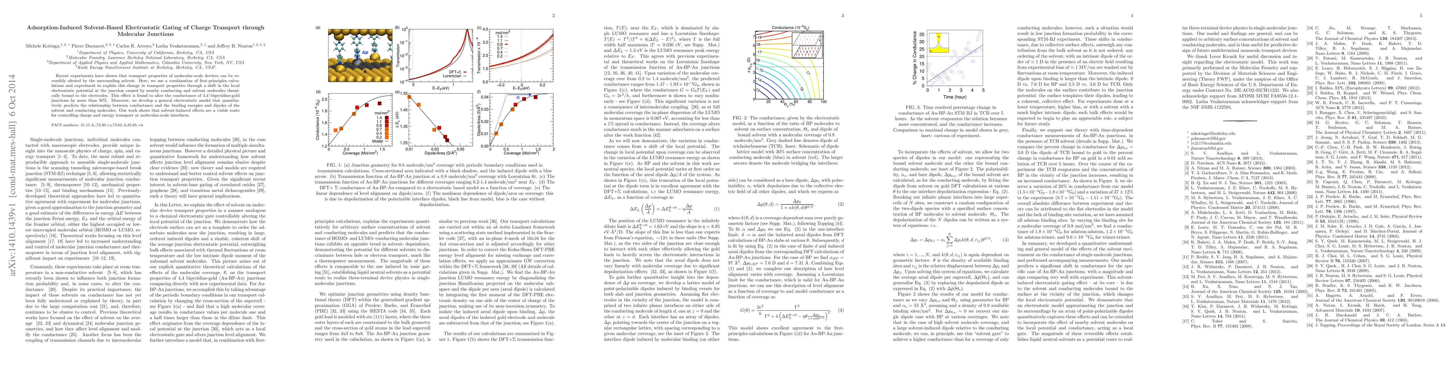 This paper demonstrates that solvent-induced electrostatic gating can significantly alter charge transport in molecular junctions, with conductance changes exceeding 50% due to adsorption of conducting and solvent molecules. The authors develop a predictive model correlating conductance with binding energies and dipoles, highlighting the potential for solvent-based control of molecular-scale transport.