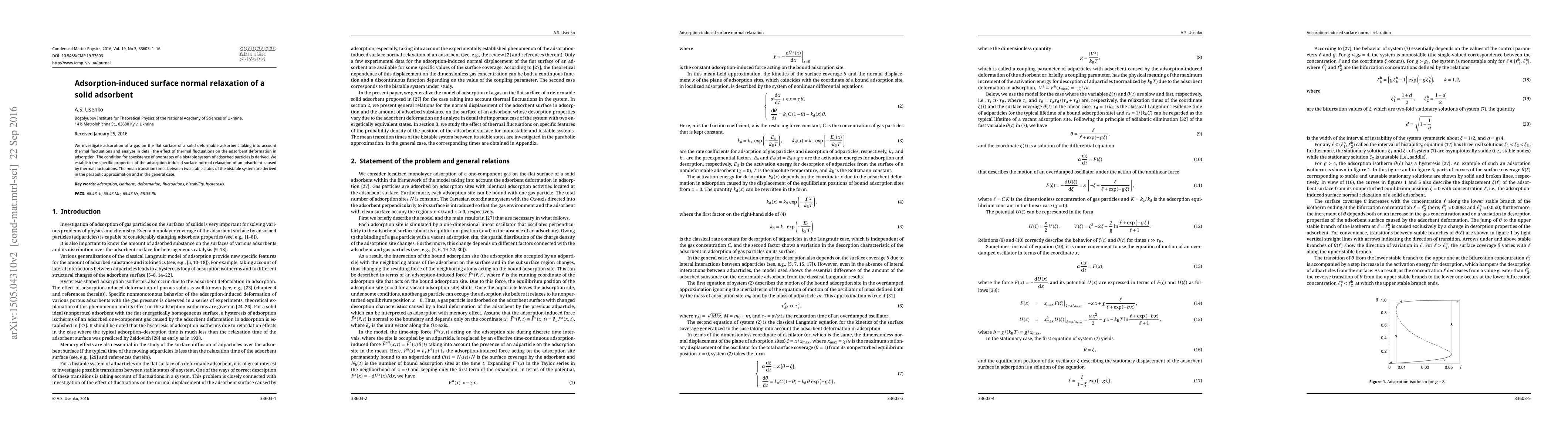 This paper explores the adsorption of gas on a deformable solid surface, considering thermal fluctuations, and derives conditions for a bistable system of adsorbed particles. It also investigates the adsorption-induced surface normal relaxation and calculates mean transition times between stable states.
