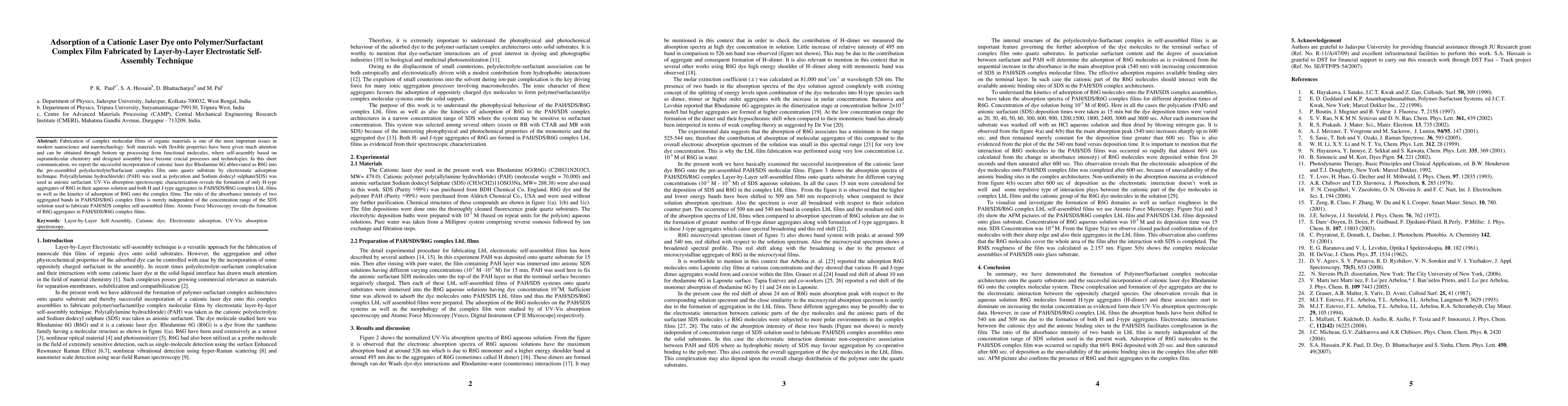 Fabrication of complex molecular films of organic materials is one of the most important issues in modern nanoscience and nanotechnology. Soft materials with flexible properties have been given much attention and can be obtained through bottom up processing from functional molecules, where self-assembly based on supramolecular chemistry and designed assembly have become crucial processes and technologies. In this short communication, we report the successful incorporation of cationic laser dye Rhodamine 6G abbreviated as R6G into the pre-assembled polyelectrolyte/Surfactant complex film onto quartz substrate by electrostatic adsorption technique. Poly(allylamine hydrochloride) (PAH) was used as polycation and Sodium dodecyl sulphate(SDS) was used as anionic surfactant. UV-Vis absorption spectroscopic characterization reveals the formation of only H-type aggregates of R6G in their aqueous solution and both H and J-type aggregates in PAH/SDS/R6G complex LbL films as well as the kinetics of adsorption of R6G onto the complex films. The ratio of the absorbance intensity of two aggregated bands in PAH/SDS/R6G complex films is merely independent of the concentration range of the SDS solution used to fabricate PAH/SDS complex self-assembled films. Atomic Force Microscopy reveals the formation of R6G aggregates in PAH/SDS/R6G complex films.