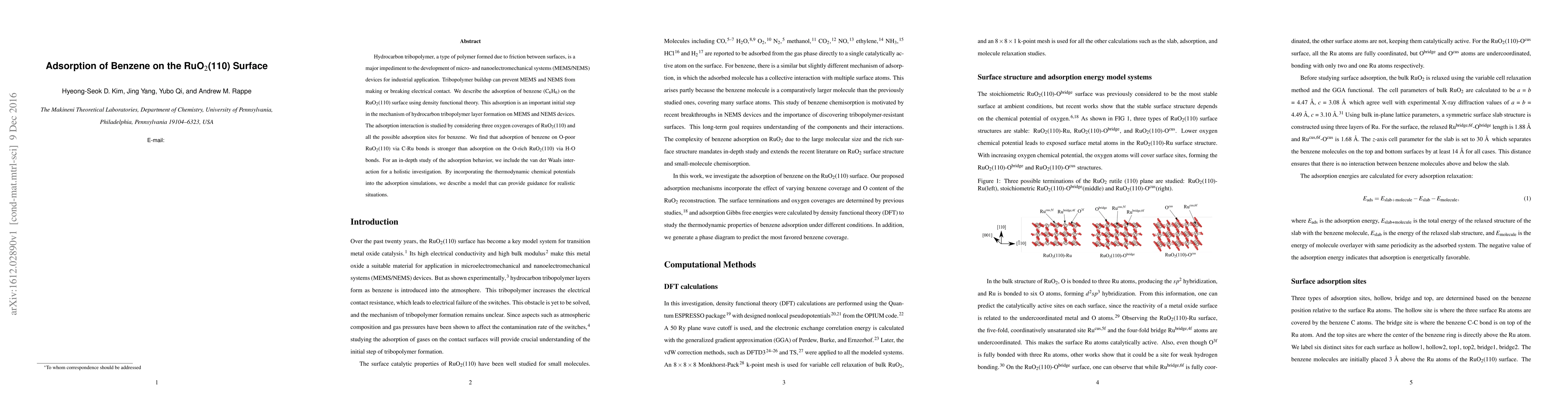 Hydrocarbon tribopolymer, a type of polymer formed due to friction between surfaces, is a major impediment to the development of micro- and nanoelectromechanical systems (MEMS/NEMS) devices for industrial application. Tribopolymer buildup can prevent MEMS and NEMS from making or breaking electrical contact. We describe the adsorption of benzene (C6H6) on the RuO2(110) surface using density functional theory. This adsorption is an important initial step in the mechanism of hydrocarbon tribopolymer layer formation on MEMS and NEMS devices. The adsorption interaction is studied by considering three oxygen coverages of RuO2(110) and all the possible adsorption sites for benzene. We find that adsorption of benzene on O-poor RuO2(110) via C-Ru bonds is stronger than adsorption on the O-rich RuO2(110) via H-O bonds. For an in-depth study of the adsorption behavior, we include the van der Waals interaction for a holistic investigation. By incorporating the thermodynamic chemical potentials into the adsorption simulations, we describe a model that can provide guidance for realistic situations.