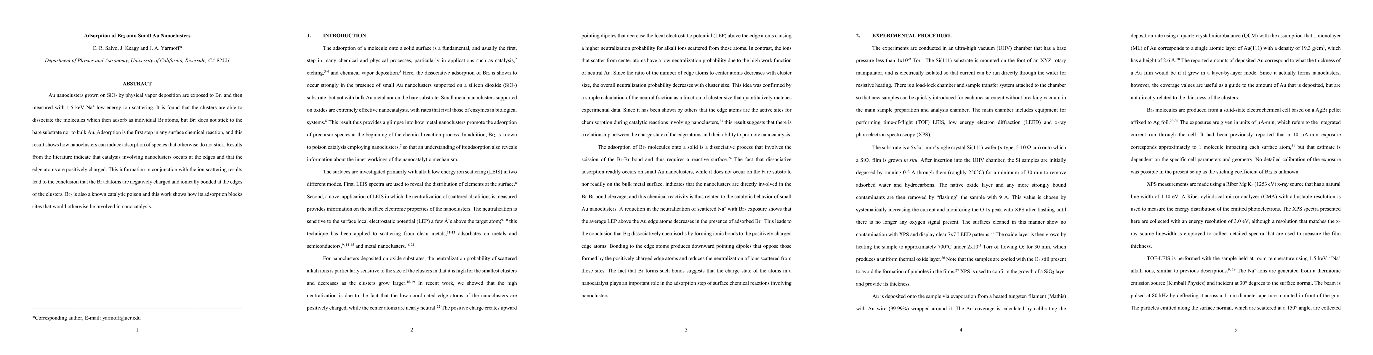 Au nanoclusters grown on SiO$_2$ by physical vapor deposition are exposed to Br$_2$ and then measured with 1.5 keV Na$^+$ low energy ion scattering. It is found that the clusters are able to dissociate the molecules which then adsorb as individual Br atoms, but Br$_2$ does not stick to the bare substrate nor to bulk Au. Adsorption is the first step in any surface chemical reaction, and this result shows how nanoclusters can induce adsorption of species that otherwise do not stick. Results from the literature indicate that catalysis involving nanoclusters occurs at the edges and that the edge atoms are positively charged. This information in conjunction with the ion scattering results lead to the conclusion that the Br adatoms are negatively charged and ionically bonded at the edges of the clusters. Br$_2$ is also a known catalytic poison and this work shows how its adsorption blocks sites that would otherwise be involved in nanocatalysis.