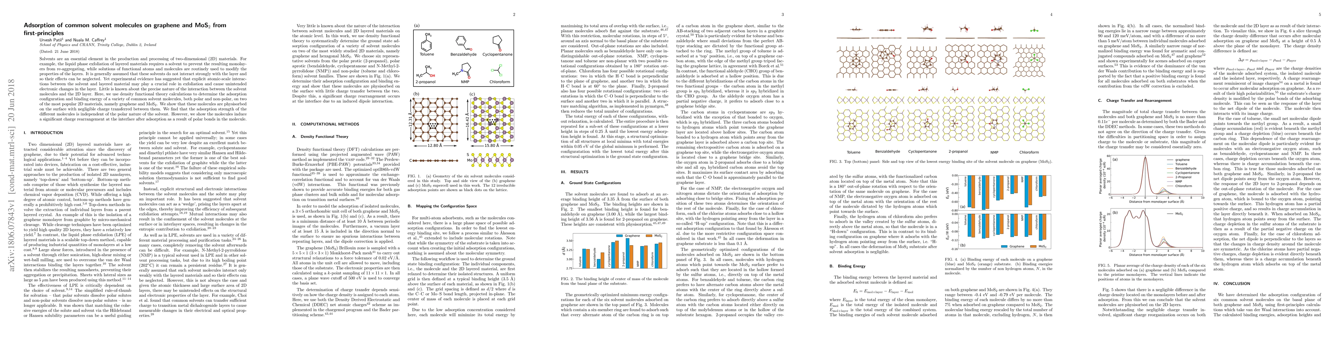 This paper uses density functional theory to investigate the adsorption of common solvent molecules on graphene and MoS$_2$, revealing that they are physisorbed with negligible charge transfer. Despite the polar nature of the solvents, adsorption strength is independent of polarity, but induces significant charge rearrangement due to polar bonds at the interface.