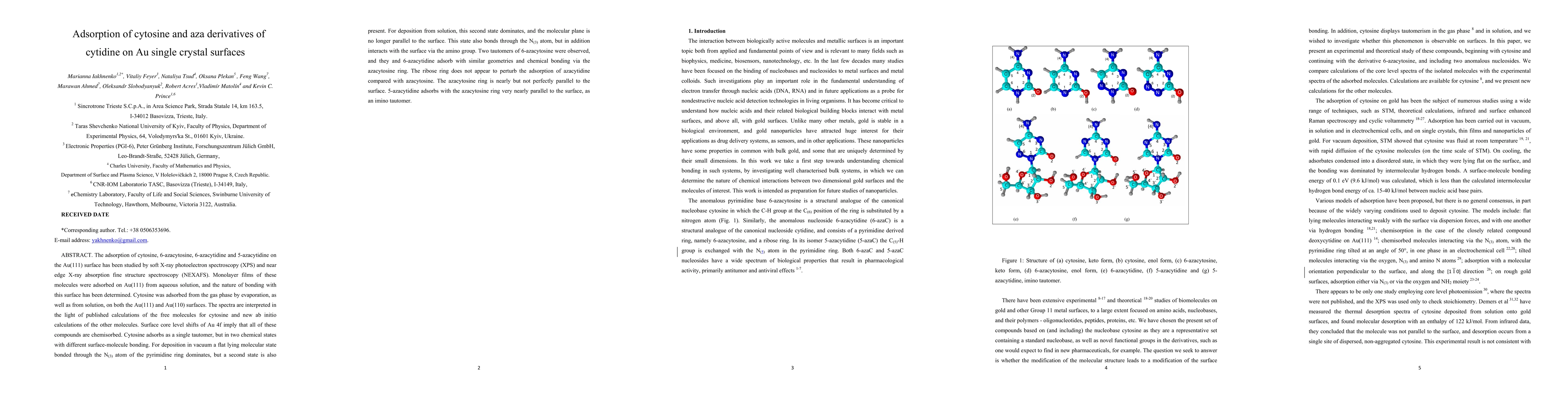 The adsorption of cytosine on the Au(111) and Au(110) surfaces has been studied using both aqueous deposition and evaporation in vacuum to prepare the samples. Soft X-ray photoelectron spectroscopy (XPS) and near edge X-ray absorption fine structure spectroscopy (NEXAFS) were used to determine the electronic structure and orientation of the adsorbates. In addition, three derivatives of cytosine, 6-azacytosine, 6-azacytidine and 5- azacytidine, were studied. Monolayer films of the latter three samples were adsorbed on Au(111) from aqueous solution, and the nature of bonding was determined. Spectra have been interpreted in the light of published calculations of free cytosine molecules and new ab initio calculations of the other compounds. Surface core level shifts of Au 4f imply that all of these compounds are chemisorbed. Cytosine adsorbs as a single tautomer, but in two chemical states with different surface-molecule bonding. For deposition in vacuum, a flat-lying molecular state bonded through the N(3) atom of the pyrimidine ring dominates, but a second state is also present. For deposition from solution, the second state dominates, with the molecular plane no longer parallel to the surface. This state also bonds through the N(3) atom, but in addition interacts with the surface via the amino group. Two tautomers of 6-azacytosine were observed, and they and 6-azacytidine adsorb with similar geometries, chemically bonding via the azacytosine ring. The ribose ring does not appear to perturb the adsorption of azacytidine compared with azacytosine. The azacytosine ring is nearly but not perfectly parallel to the surface, like 5-azacytidine, which adsorbs as an imino tautomer. ...
