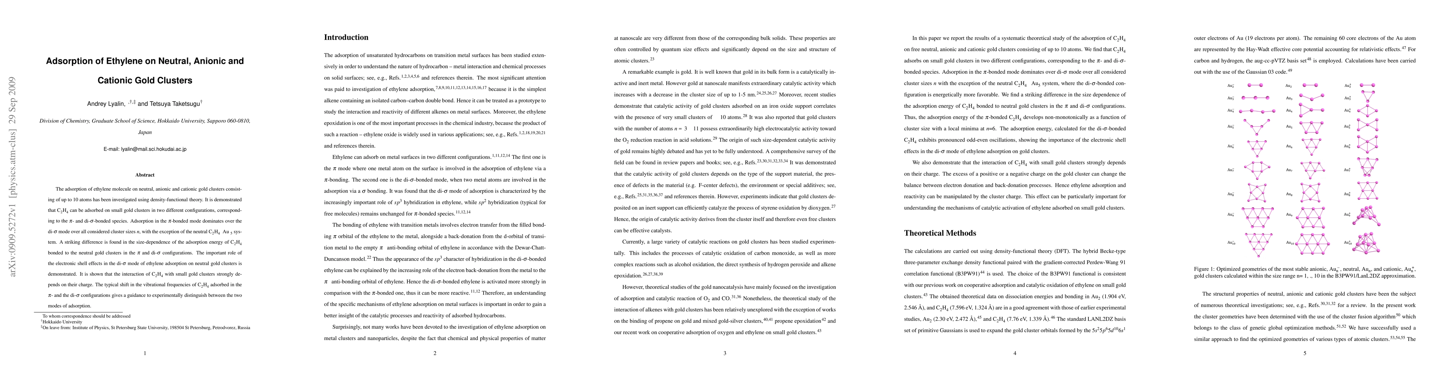 This study investigates ethylene adsorption on neutral, anionic, and cationic gold clusters using density-functional theory, revealing two adsorption configurations: pi-bonded and di-sigma-bonded. The pi-bonded mode predominantly dominates except for neutral Au5 clusters, highlighting the influence of electronic shell effects and cluster charge on adsorption dynamics.