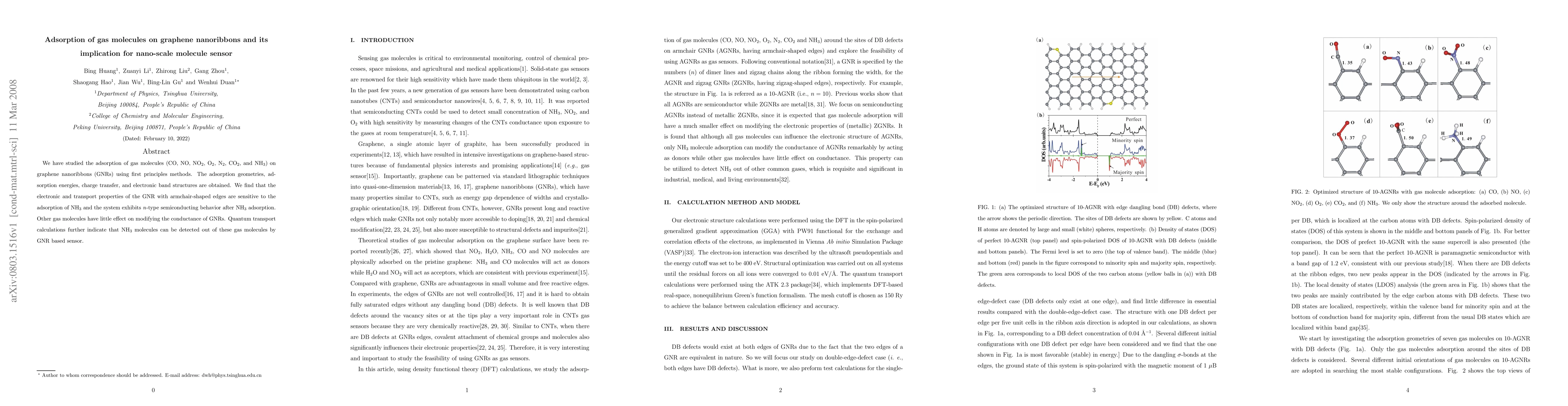 Summary: The adsorption of various gas molecules on graphene nanoribbons (GNRs) is investigated, revealing that NH3 significantly alters the electronic properties, enabling GNR-based sensors to detect NH3 effectively compared to other gases. GNRs with armchair edges exhibit n-type semiconducting behavior post-NH3 adsorption.