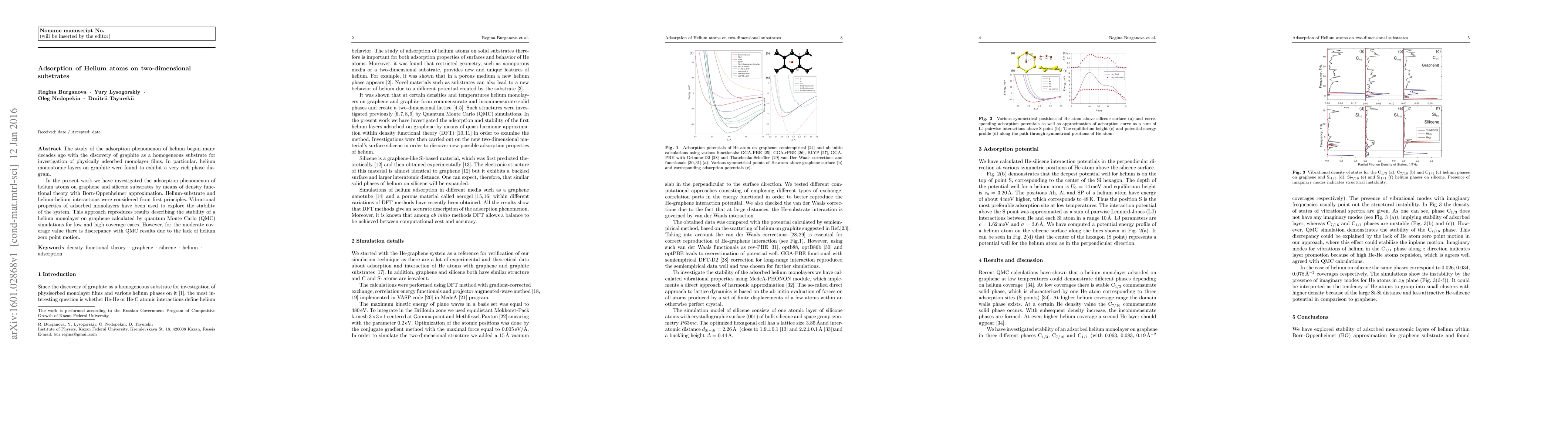 The study of the adsorption phenomenon of helium began many decades ago with the discovery of graphite as a homogeneous substrate for investigation of physically adsorbed monolayer films. In particular, helium monoatomic layers on graphite were found to exhibit a very rich phase diagram. In the present work we have investigated the adsorption phenomenon of helium atoms on graphene and silicene substrates by means of density functional theory with Born-Oppenheimer approximation. Helium-substrate and helium-helium interactions were considered from first principles. Vibrational properties of adsorbed monolayers have been used to explore the stability of the system. This approach reproduces results describing the stability of a helium monolayer on graphene calculated by quantum Monte Carlo (QMC) simulations for low and high coverage cases. However, for the moderate coverage value there is discrepancy with QMC results due to the lack of helium zero point motion.
