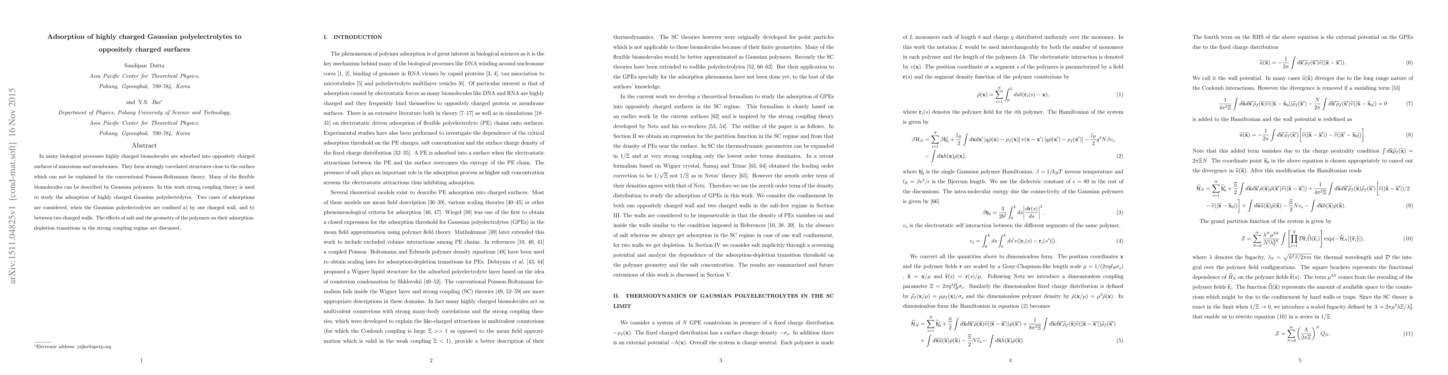 In many biological processes highly charged biomolecules are adsorbed into oppositely charged surfaces of macroions and membranes. They form strongly correlated structures close to the surface which can not be explained by the conventional Poisson-Boltzmann theory. Many of the flexible biomolecules can be described by Gaussian polymers. In this work strong coupling theory is used to study the adsorption of highly charged Gaussian polyelectrolytes. Two cases of adsorptions are considered, when the Gaussian polyelectrolytes are confined a) by one charged wall, and b) between two charged walls. The effects of salt and the geometry of the polymers on their adsorption- depletion transitions in the strong coupling regime are discussed.