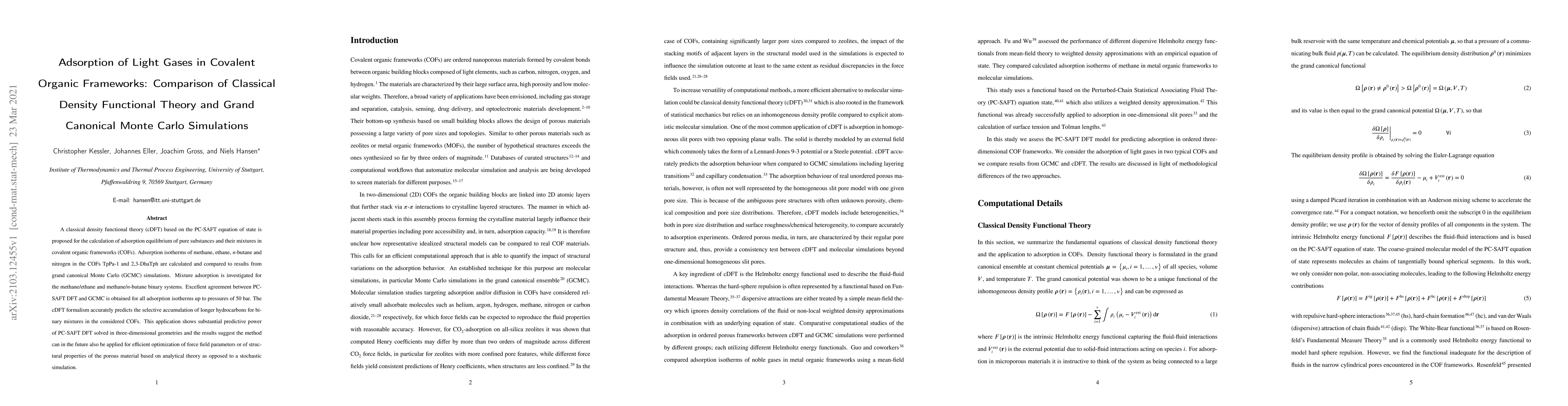 This paper proposes a classical density functional theory (cDFT) based on the PC-SAFT equation of state to calculate adsorption equilibria in covalent organic frameworks (COFs), comparing it to grand canonical Monte Carlo (GCMC) simulations. The method shows excellent agreement with GCMC for adsorption isotherms of methane, ethane, n-butane, and nitrogen in COFs, indicating its potential for optimizing force field parameters and material structures.