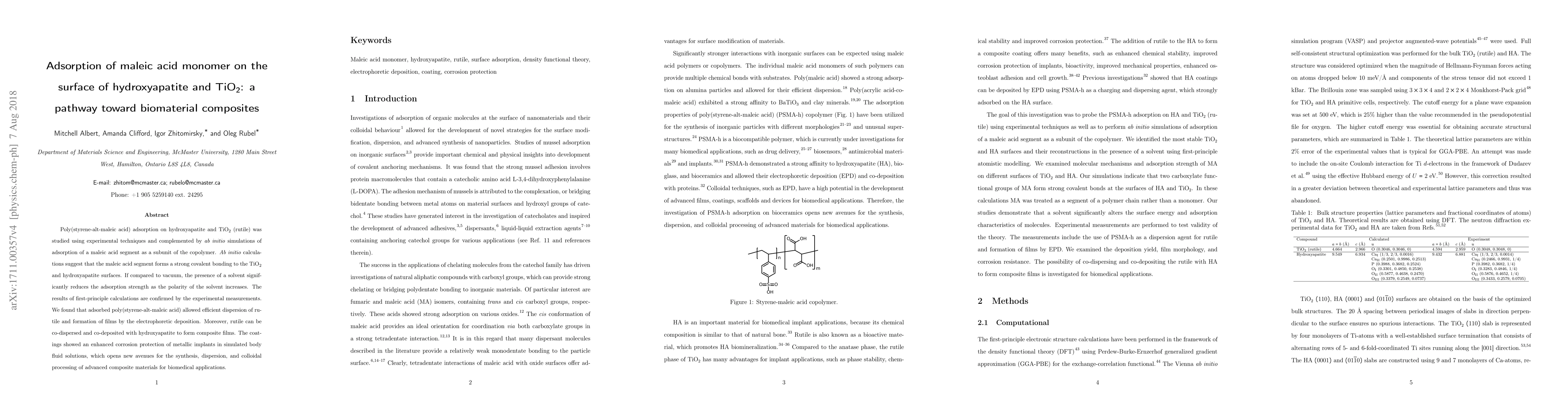 This study investigates the adsorption of poly(styrene-alt-maleic acid) on hydroxyapatite and TiO2 surfaces using both experimental and computational methods, revealing strong covalent bonding facilitated by maleic acid segments. The results suggest enhanced dispersion and composite film formation, leading to improved corrosion protection for biomedical implants.