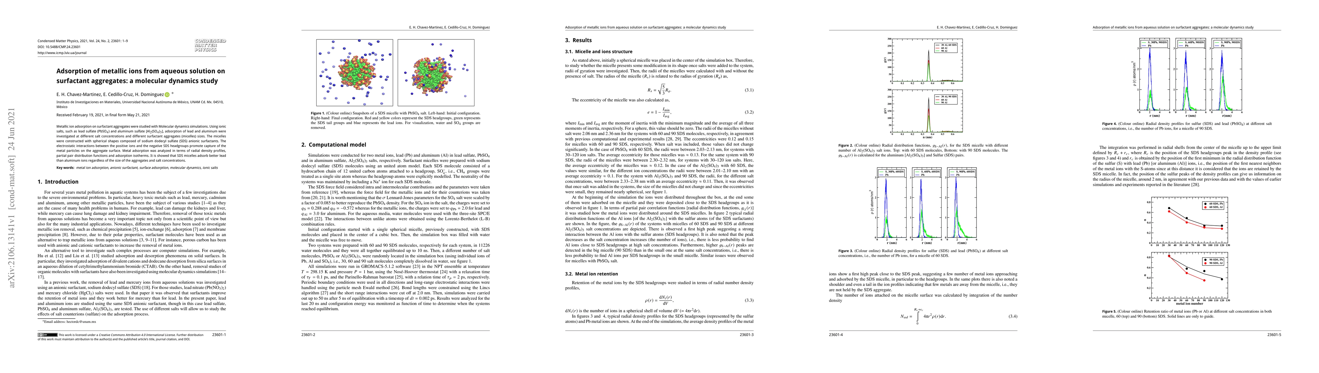 This study uses molecular dynamics simulations to investigate the adsorption of lead and aluminum ions on spherical SDS micelles. Results show that SDS micelles preferentially adsorb lead over aluminum ions, regardless of micelle size and salt concentration, due to electrostatic interactions.