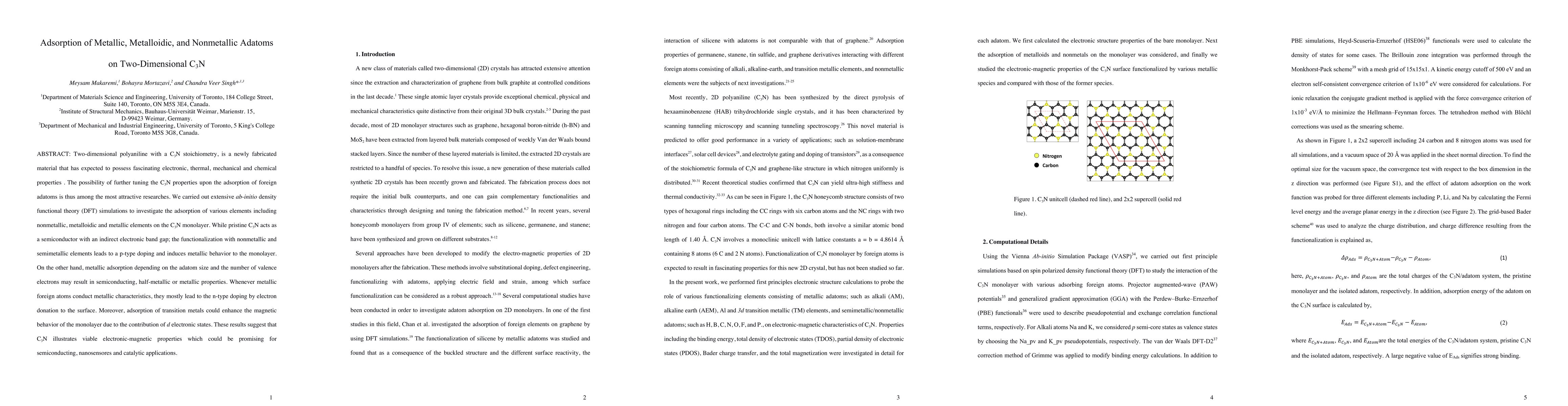 Researchers studied the adsorption of various elements on 2D C3N, a material with promising electronic and thermal properties. The study found that adsorption can lead to metallic or p-type doping behavior, making it suitable for semiconducting, nanosensors, and catalytic applications.