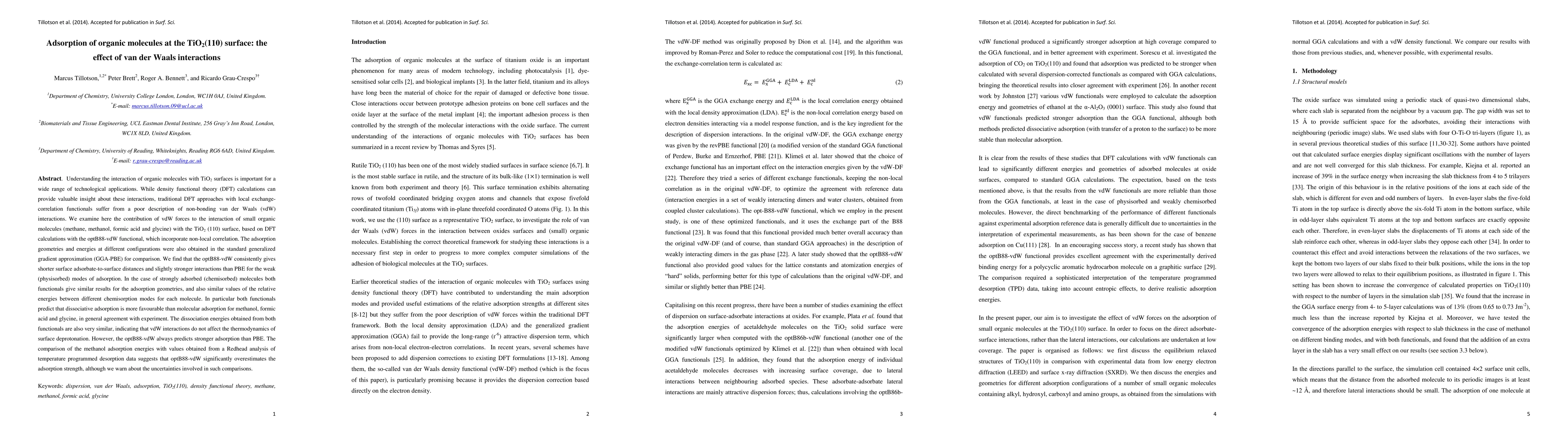 This paper examines the role of van der Waals interactions in the adsorption of organic molecules (methane, methanol, formic acid, and glycine) on the TiO2(110) surface using DFT calculations. The optB88-vdW functional yields stronger and closer adsorption geometries compared to GGA-PBE, particularly for weak interactions, though both predict similar results for strongly adsorbed molecules.