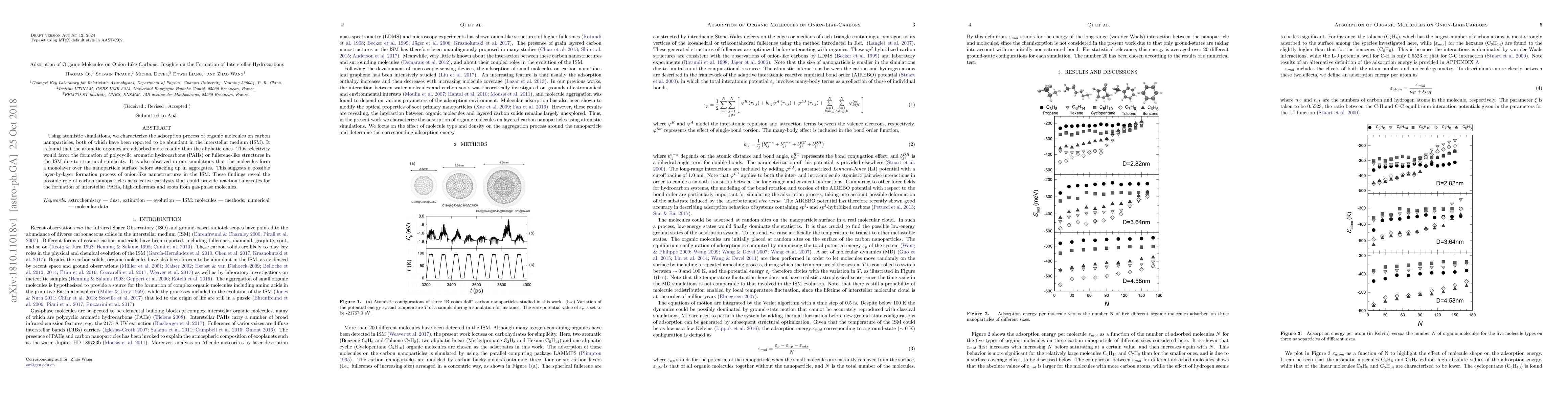 Researchers used atomistic simulations to study how organic molecules adsorb onto carbon nanoparticles found in space, finding that aromatic molecules bind more easily and forming polycyclic structures with a possible layer-by-layer process.
