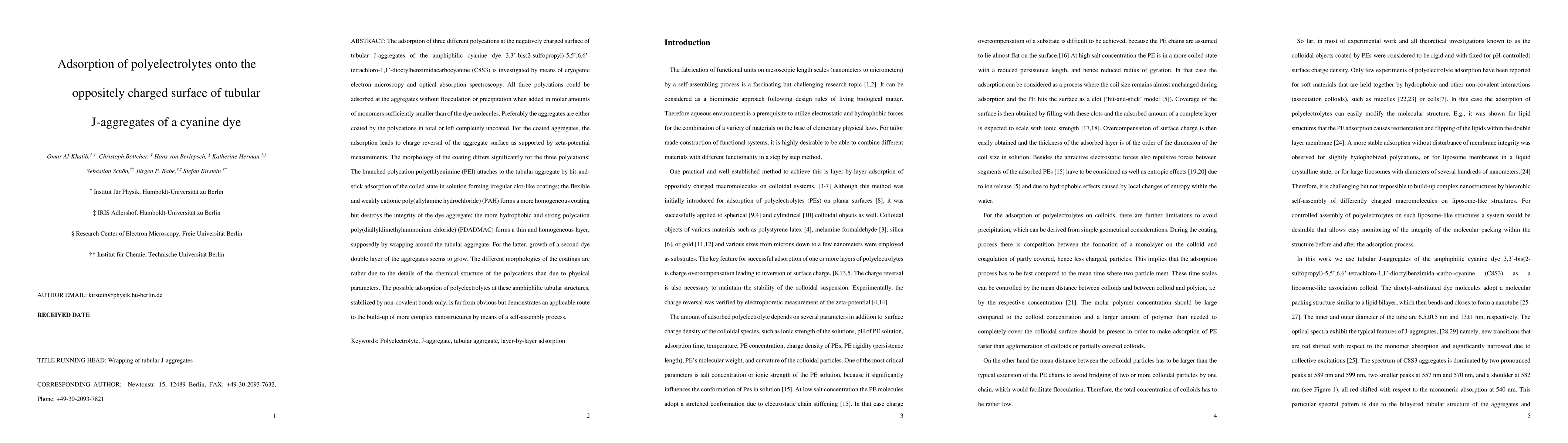 This study investigates the adsorption of three polycations onto the negatively charged surface of tubular J-aggregates of a cyanine dye, revealing distinct coating morphologies and charge reversal, while demonstrating the potential for self-assembly in nanostructure formation.