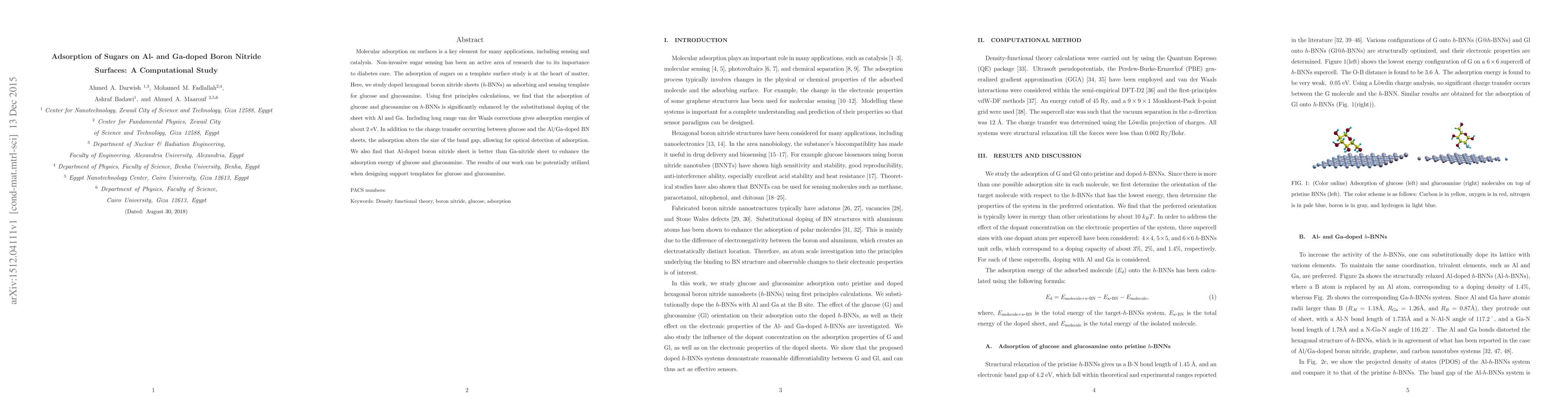 This study investigates the adsorption of glucose and glucosamine on Al- and Ga-doped hexagonal boron nitride sheets using first principles calculations. The results reveal that doping significantly enhances adsorption, with Al-doped sheets showing superior performance, offering potential for designing effective sensing templates for sugar detection.