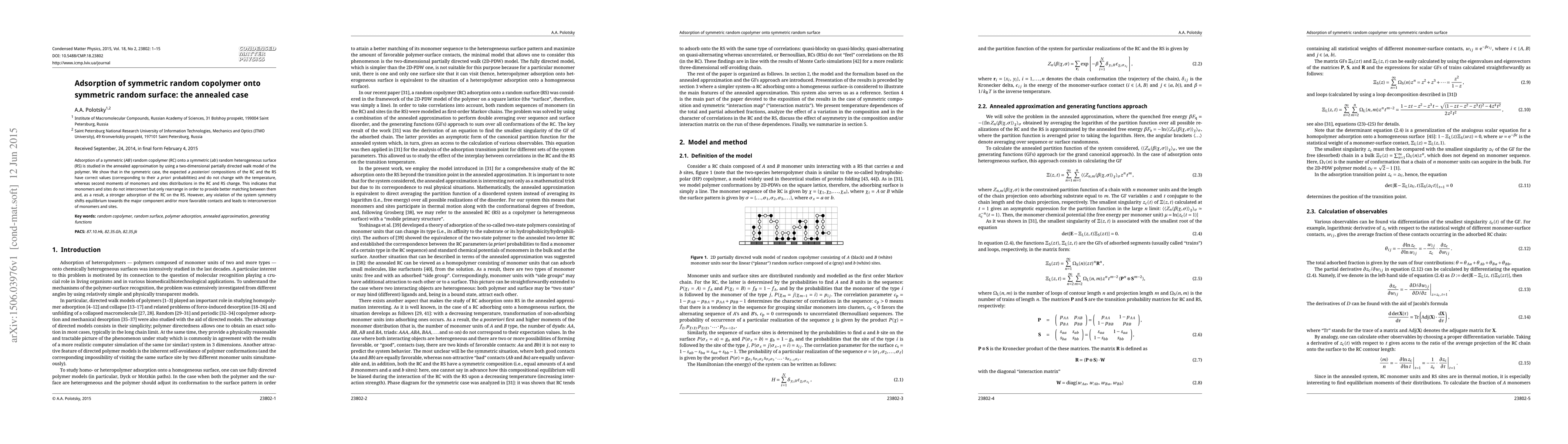 A study on the adsorption of a symmetric random copolymer onto a symmetric random surface found that symmetrical systems exhibit stable compositions with no temperature changes, while asymmetrical systems lead to interconversion between monomers and sites.