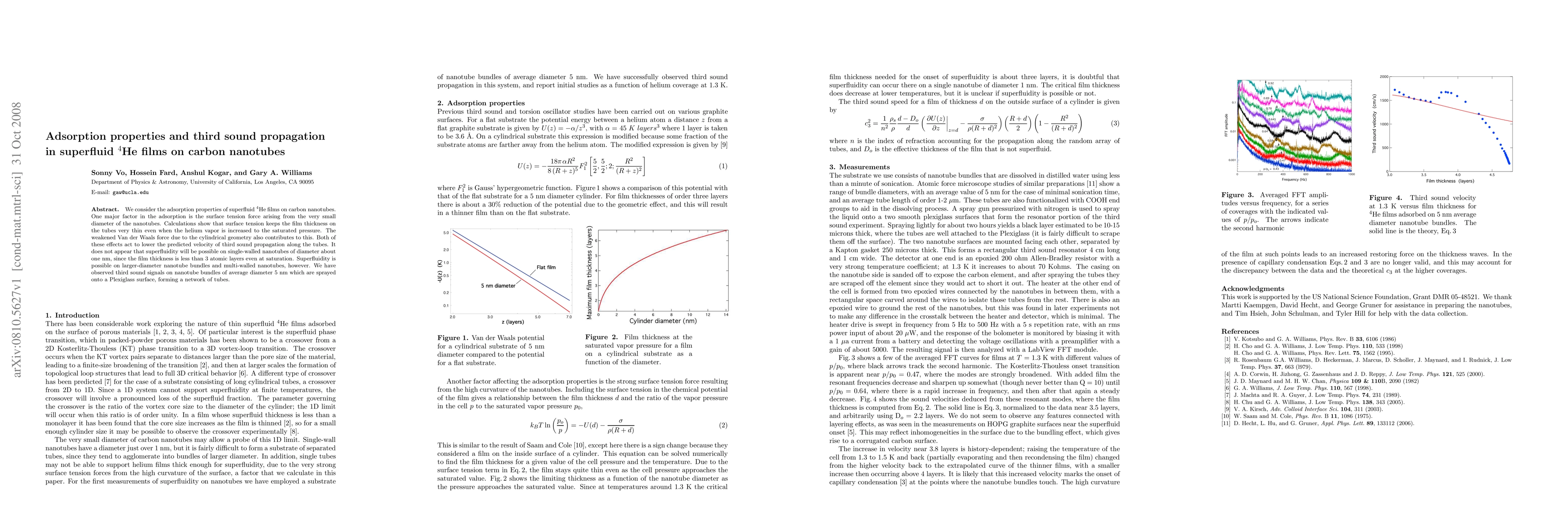 This study investigates the adsorption of superfluid $^4$He on carbon nanotubes, revealing that surface tension and weakened Van der Waals forces maintain thin film thickness, impeding third sound propagation. Superfluidity is feasible on larger nanotube bundles but not on single-walled nanotubes due to insufficient film thickness.