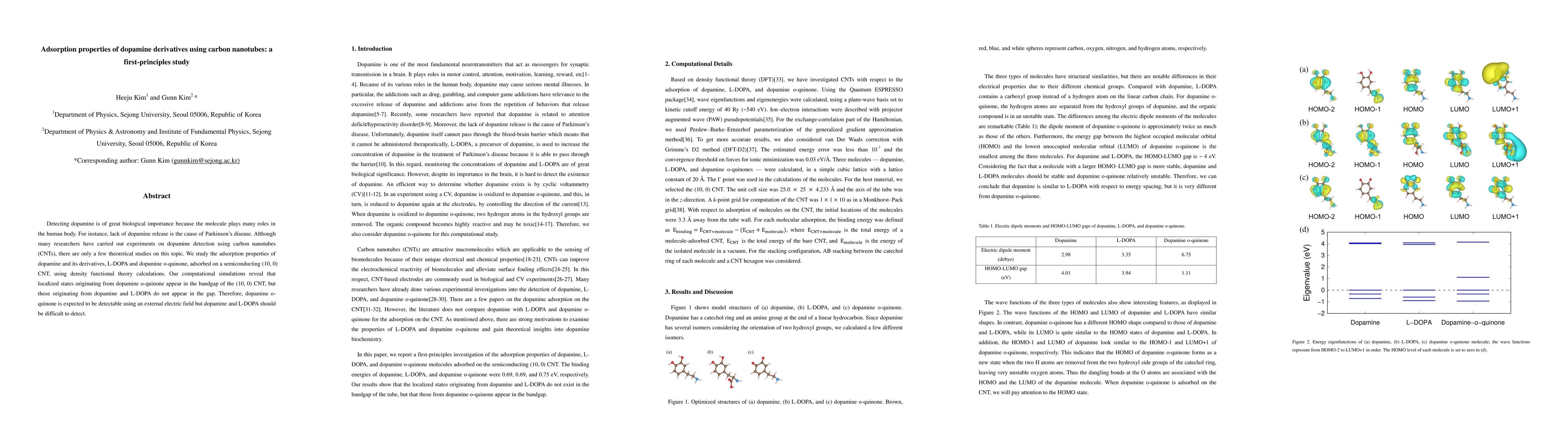 Detecting dopamine is of great biological importance because the molecule plays many roles in the human body. For instance, the lack of dopamine release is the cause of Parkinson's disease. Although many researchers have carried out experiments on dopamine detection using carbon nanotubes (CNTs), there are only a few theoretical studies on this topic. We study the adsorption properties of dopamine and its derivatives, L-DOPA and dopamine o-quinone, adsorbed on a semiconducting (10, 0) CNT, using density functional theory calculations. Our computational simulations reveal that localized states originating from dopamine o-quinone appear in the bandgap of the (10, 0) CNT, but those originating from dopamine and L-DOPA do not appear in the gap. Therefore, dopamine o-quinone is expected to be detectable using an external electric field but dopamine and L-DOPA should be difficult to detect.
