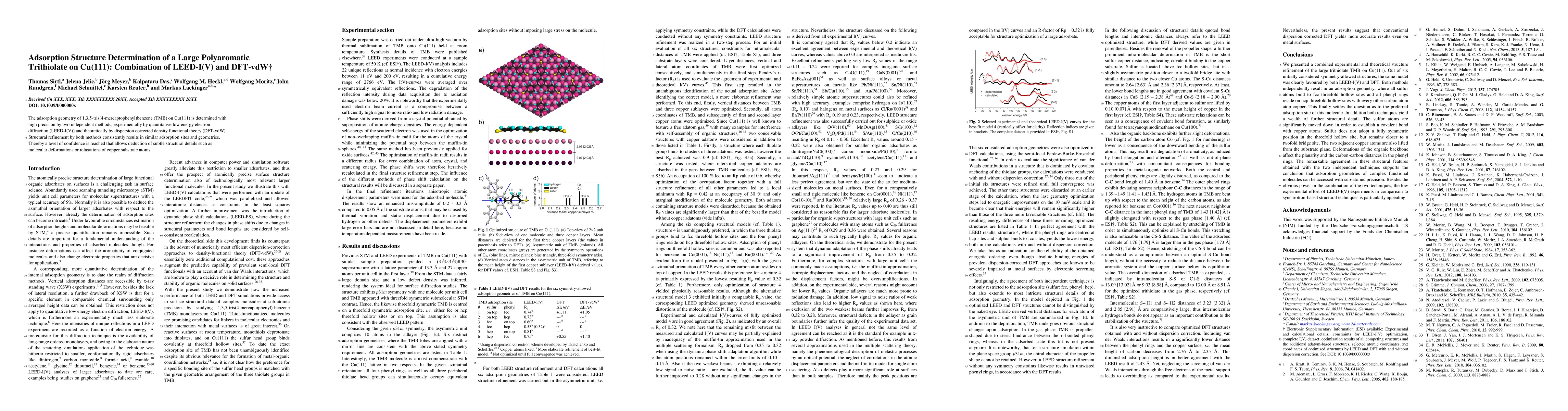 The adsorption geometry of 1,3,5-tris(4-mercaptophenyl)benzene (TMB) on Cu(111) is determined with high precision using two independent methods, experimentally by quantitative low energy electron diffraction (LEED-I(V)) and theoretically by dispersion corrected density functional theory (DFT-vdW). Structural refinement using both methods consistently results in similar adsorption sites and geometries. Thereby a level of confidence is reached that allows deduction of subtle structural details such as molecular deformations or relaxations of copper substrate atoms.