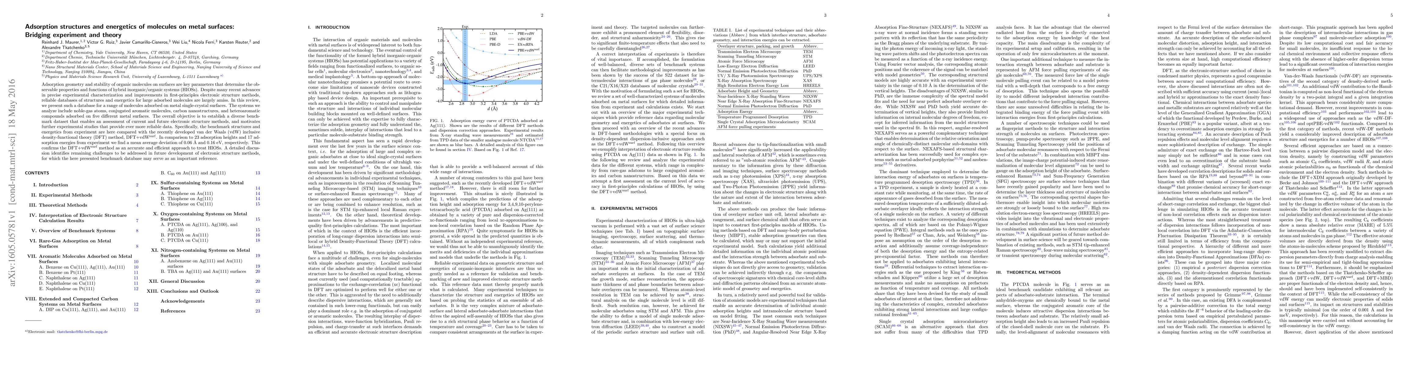 This paper reviews a comprehensive database of adsorption structures and energetics for various organic molecules on metal surfaces, comparing experimental data with the DFT+vdW$^{\mathrm{surf}}$ method. The study establishes a benchmark dataset to evaluate electronic structure methods and highlights remaining challenges for future improvements.