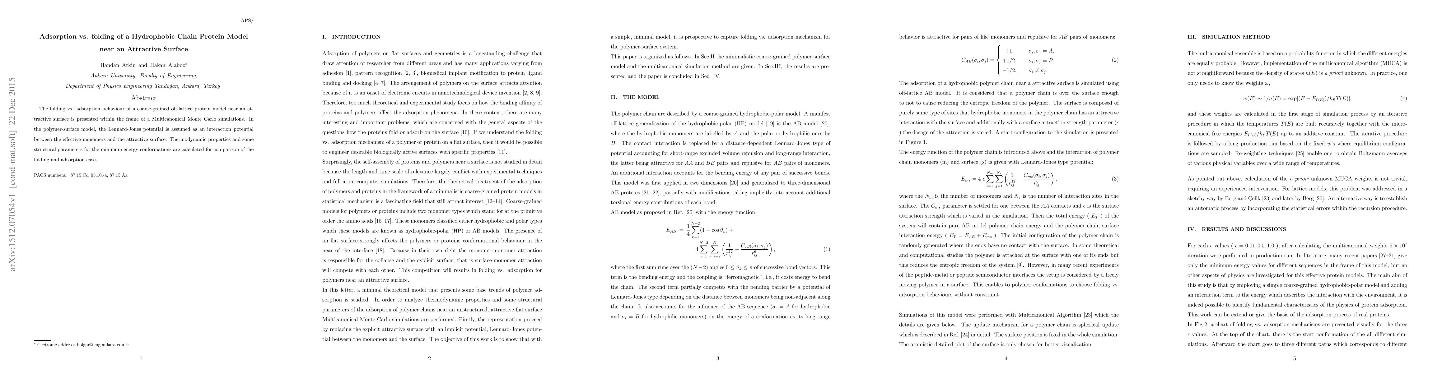 This study uses Multicanonical Monte Carlo simulations to compare the folding and adsorption behaviors of a coarse-grained protein model near an attractive surface, employing the Lennard-Jones potential for interactions. Thermodynamic properties and structural parameters of the minimum energy conformations are analyzed to distinguish between folding and adsorption.