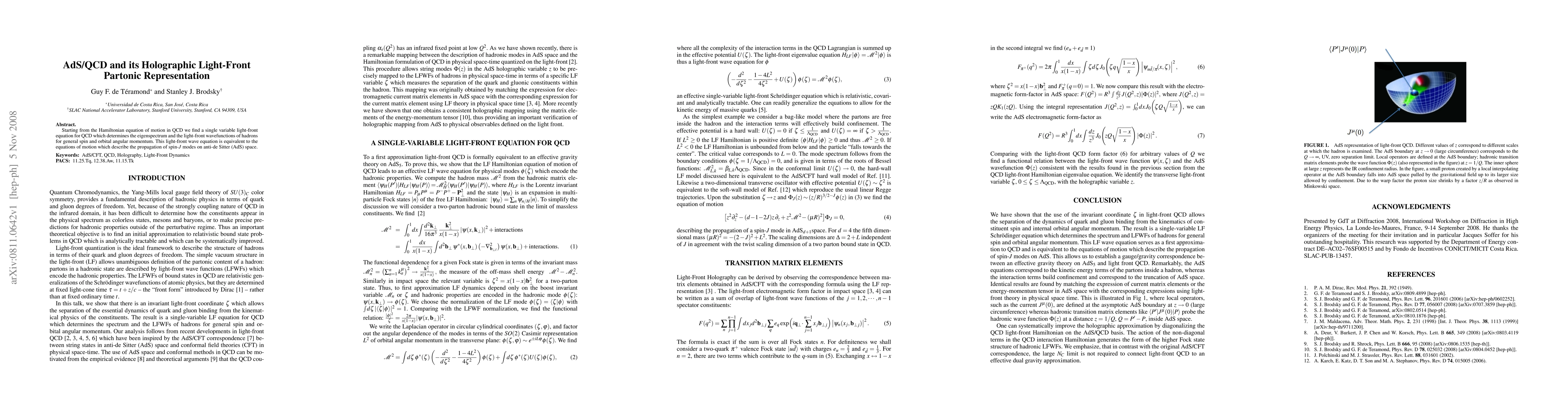 Starting from the Hamiltonian equation of motion in QCD we find a single variable light-front equation for QCD which determines the eigenspectrum and the light-front wavefunctions of hadrons for general spin and orbital angular momentum. This light-front wave equation is equivalent to the equations of motion which describe the propagation of spin-$J$ modes on anti-de Sitter (AdS) space.