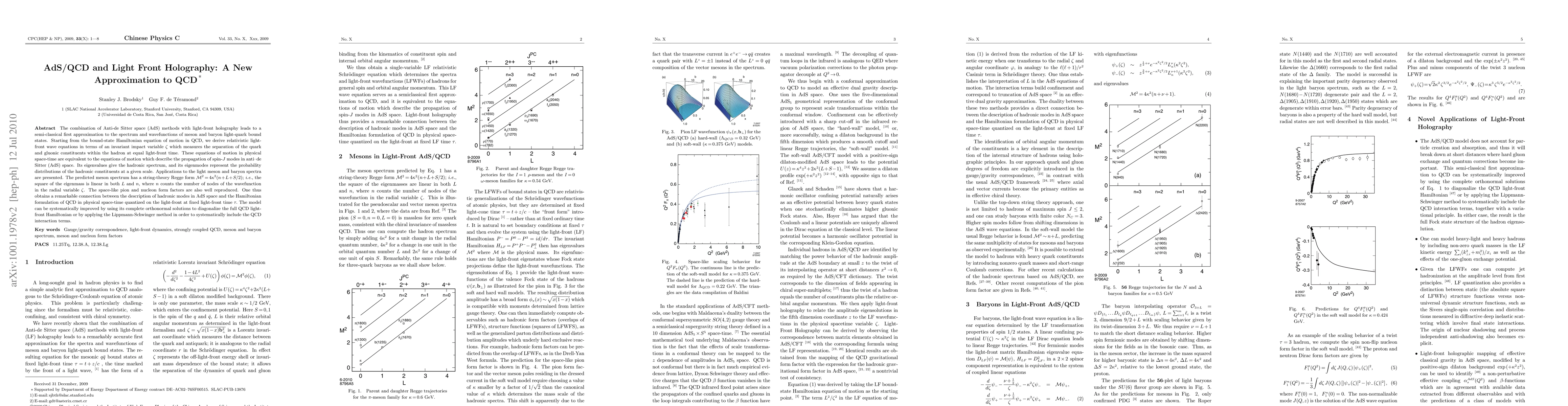 The combination of Anti-de Sitter space (AdS) methods with light-front holography leads to a semi-classical first approximation to the spectrum and wavefunctions of meson and baryon light-quark bound states. Starting from the bound-state Hamiltonian equation of motion in QCD, we derive relativistic light-front wave equations in terms of an invariant impact variable zeta which measures the separation of the quark and gluonic constituents within the hadron at equal light-front time. These equations of motion in physical space-time are equivalent to the equations of motion which describe the propagation of spin-J modes in anti--de Sitter (AdS) space. Its eigenvalues give the hadronic spectrum, and its eigenmodes represent the probability distributions of the hadronic constituents at a given scale. Applications to the light meson and baryon spectra are presented. The predicted meson spectrum has a string-theory Regge form ${\cal M}^2 = 4 \kappa^2(n+L+S/2)$; i.e., the square of the eigenmass is linear in both L and n, where n counts the number of nodes of the wavefunction in the radial variable zeta. The space-like pion and nucleon form factors are also well reproduced. One thus obtains a remarkable connection between the description of hadronic modes in AdS space and the Hamiltonian formulation of QCD in physical space-time quantized on the light-front at fixed light-front time. The model can be systematically improved by using its complete orthonormal solutions to diagonalize the full QCD light-front Hamiltonian or by applying the Lippmann-Schwinger method in order to systematically include the QCD interaction terms.