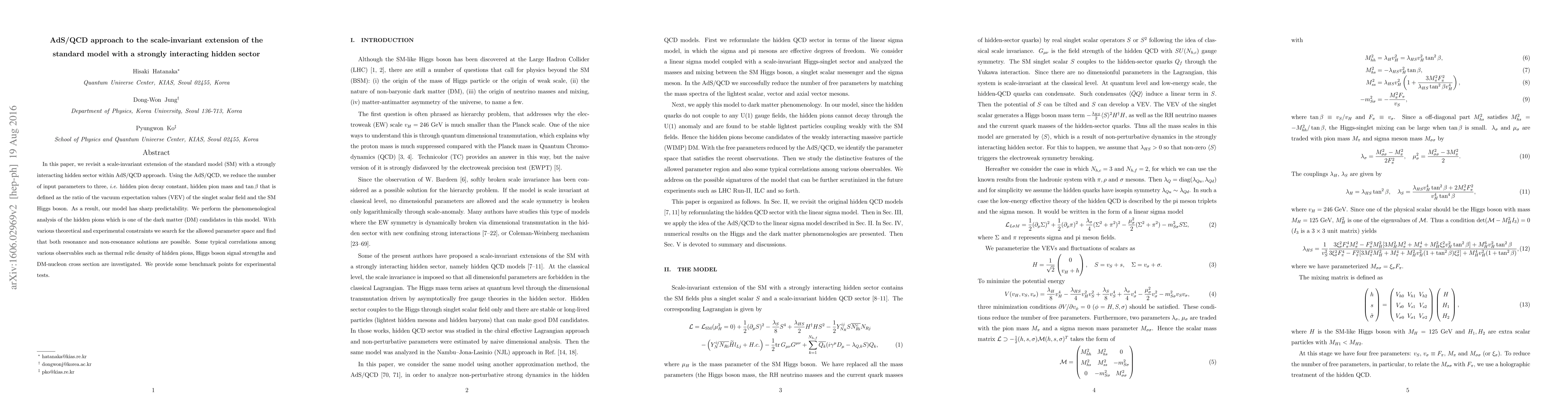 This paper proposes a scale-invariant extension of the Standard Model incorporating a strongly interacting hidden sector via the AdS/QCD framework, reducing the model's parameters to three. It analyzes hidden pions as potential dark matter candidates, exploring allowed parameter spaces and correlations among various observables, and provides benchmark points for experimental validation.