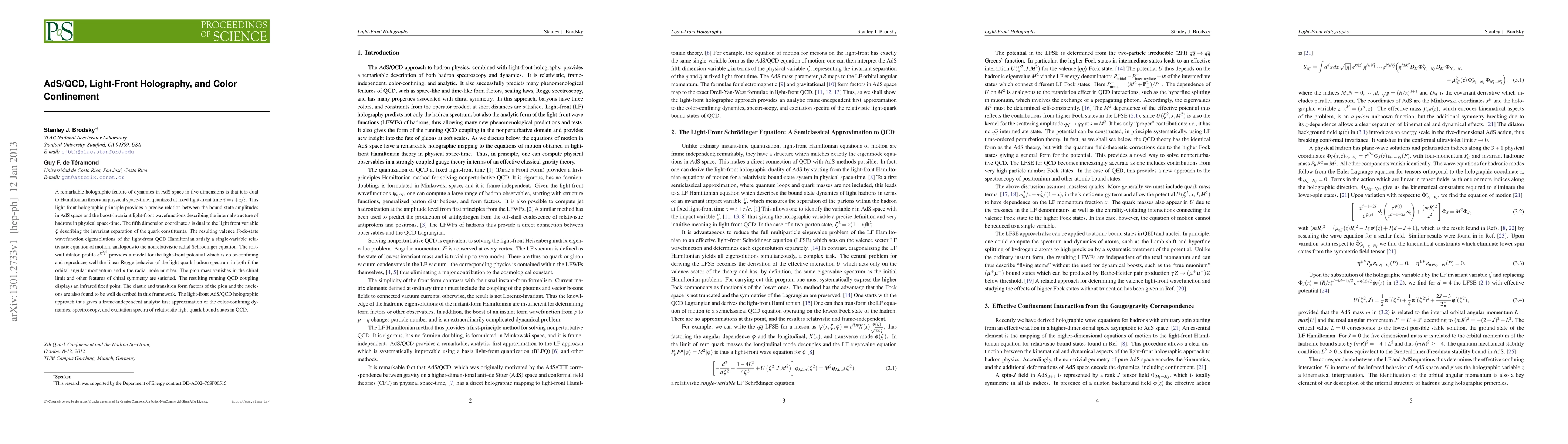 The paper explores the AdS/QCD model using light-front holography to describe color confinement and hadron structure, showing that the soft-wall dilaton profile effectively reproduces the linear Regge behavior and chiral symmetry features. The approach provides a frame-independent analytic framework for understanding the dynamics, spectroscopy, and spectra of light-quark bound states in QCD.