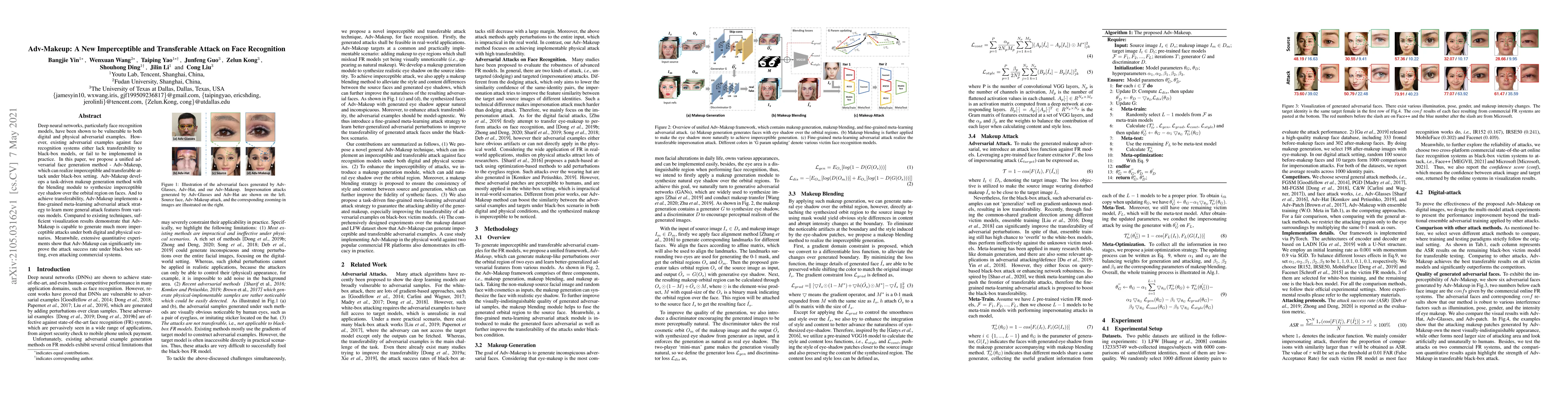 This paper introduces Adv-Makeup, a novel attack method for face recognition systems that generates imperceptible and transferable adversarial examples under black-box settings. Adv-Makeup employs a makeup-based approach to synthesize eye shadow and uses meta-learning to enhance transferability, significantly improving attack success rates against various models, including commercial systems.