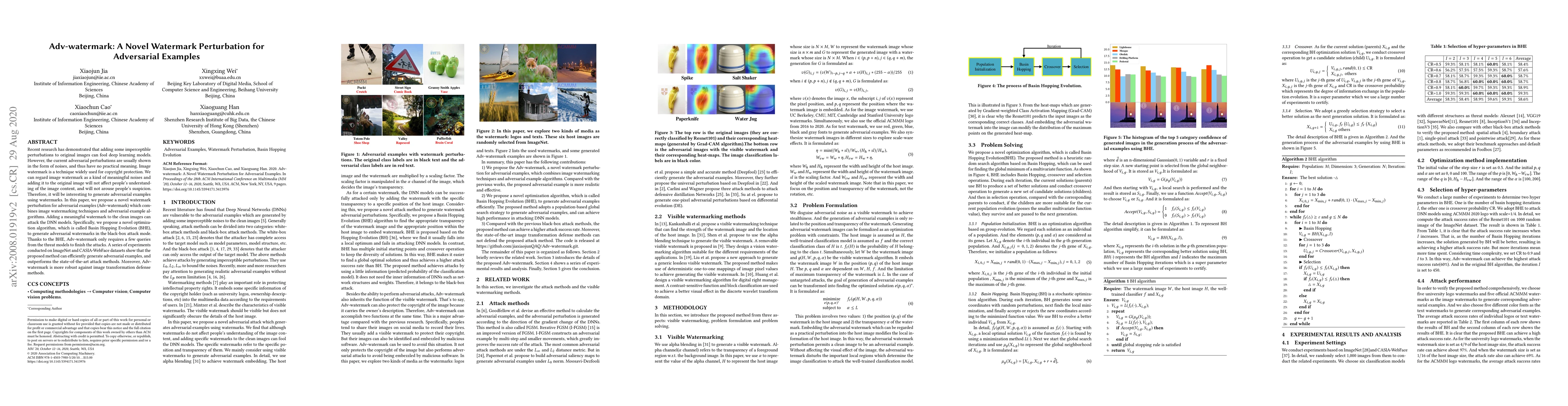 This paper proposes Adv-watermark, a novel watermark perturbation technique for generating adversarial examples that combine image watermarking and adversarial attack algorithms. The Basin Hopping Evolution (BHE) optimization algorithm enables efficient black-box attacks with minimal queries, demonstrating superior performance and robustness against image transformation defenses compared to state-of-the-art methods.