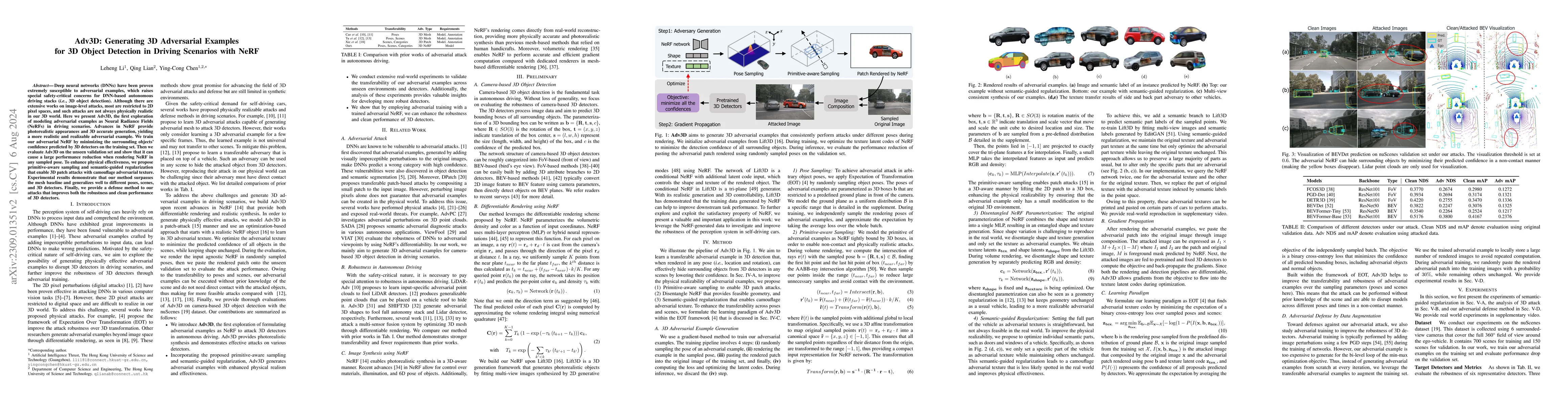 Adv3D introduces a method for generating 3D adversarial examples using Neural Radiance Fields (NeRF) to create realistic attacks on 3D object detectors in autonomous driving. The approach demonstrates significant performance reduction in detectors when rendering adversarial NeRFs in various poses, showcasing the effectiveness of 3D-aware adversarial attacks.
