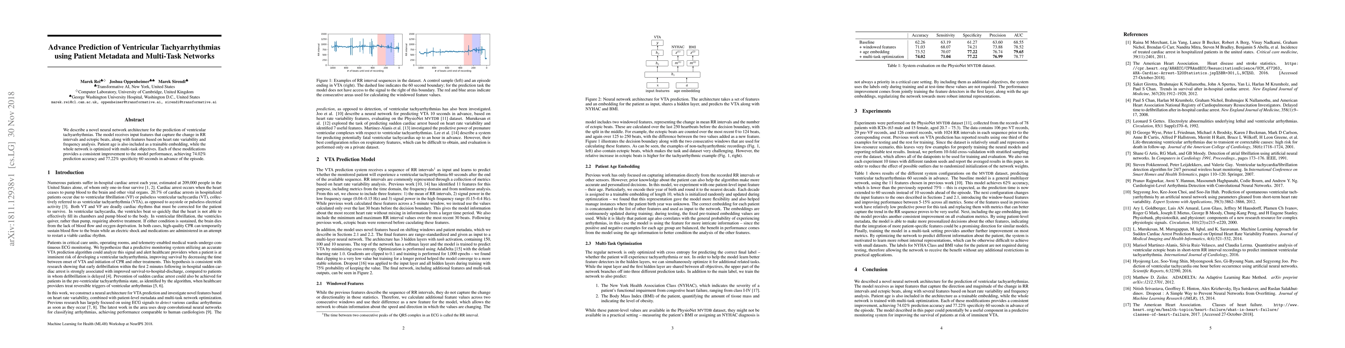 This paper introduces a neural network architecture that uses patient metadata and multi-task learning to predict ventricular tachyarrhythmias with 74.02% accuracy and 77.22% specificity 60 seconds in advance. The model incorporates features like RR intervals, ectopic beats, and heart rate variability, along with a trainable embedding for patient age.