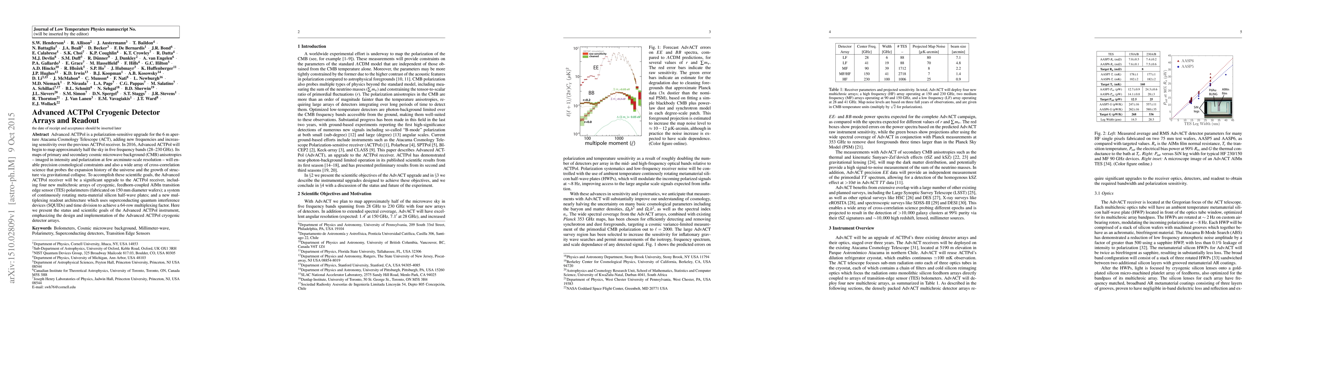 The Advanced ACTPol upgrade enhances the Atacama Cosmology Telescope's sensitivity and frequency range, employing new cryogenic detector arrays and a multiplexing readout system to map cosmic microwave background anisotropies with high resolution. This upgrade aims to provide precise cosmological constraints and enable a wide range of cross-correlation studies.