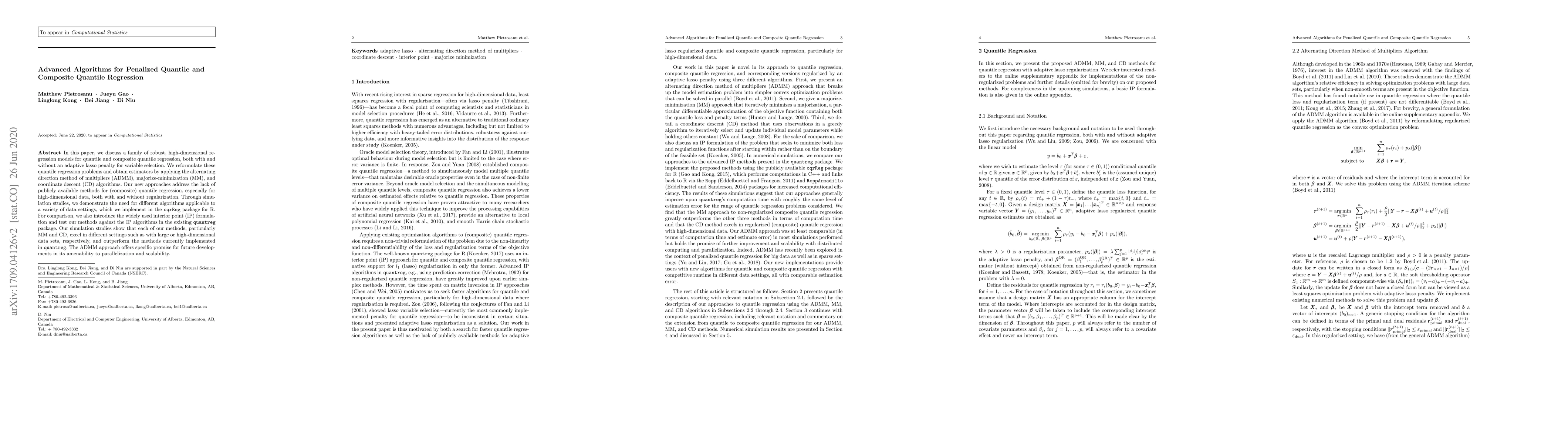 This paper introduces advanced algorithms for penalized quantile and composite quantile regression, employing ADMM, MM, and CD methods. Simulation studies show that these new approaches outperform existing methods in quantreg, especially for high-dimensional data, and the ADMM method shows promise for scalability and parallelization.
