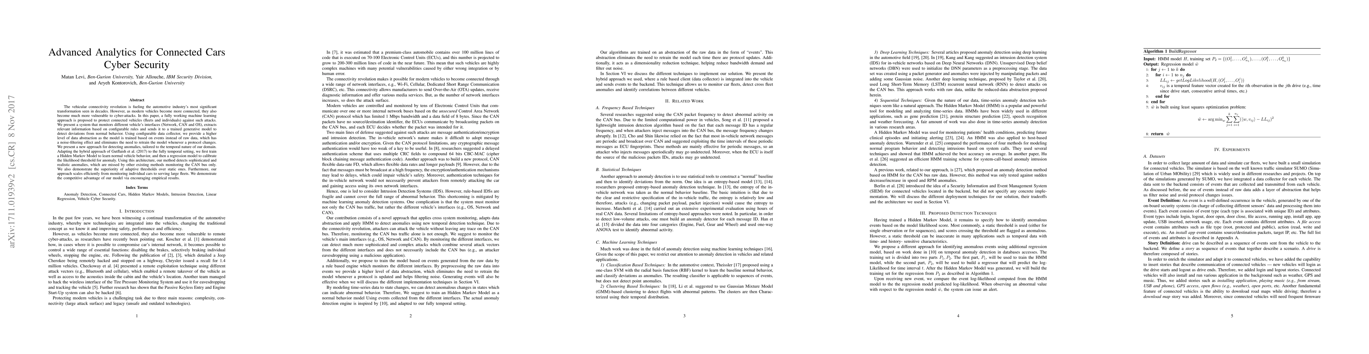 The vehicular connectivity revolution is fueling the automotive industry's most significant transformation seen in decades. However, as modern vehicles become more connected, they also become much more vulnerable to cyber-attacks. In this paper, a fully working machine learning approach is proposed to protect connected vehicles (fleets and individuals) against such attacks. We present a system that monitors different vehicle's interfaces (Network, CAN and OS), extracts relevant information based on configurable rules and sends it to a trained generative model to detect deviations from normal behavior. Using configurable data collector, we provide a higher level of data abstraction as the model is trained based on events instead of raw data, which has a noise-filtering effect and eliminates the need to retrain the model whenever a protocol changes. We present a new approach for detecting anomalies, tailored to the temporal nature of our domain. Adapting the hybrid approach of Gutflaish et al. (2017) to the fully temporal setting, we first train a Hidden Markov Model to learn normal vehicle behavior, and then a regression model to calibrate the likelihood threshold for anomaly. Using this architecture, our method detects sophisticated and realistic anomalies, which are missed by other existing methods monitoring the CAN bus only. We also demonstrate the superiority of adaptive thresholds over static ones. Furthermore, our approach scales efficiently from monitoring individual cars to serving large fleets. We demonstrate the competitive advantage of our model via encouraging empirical results.