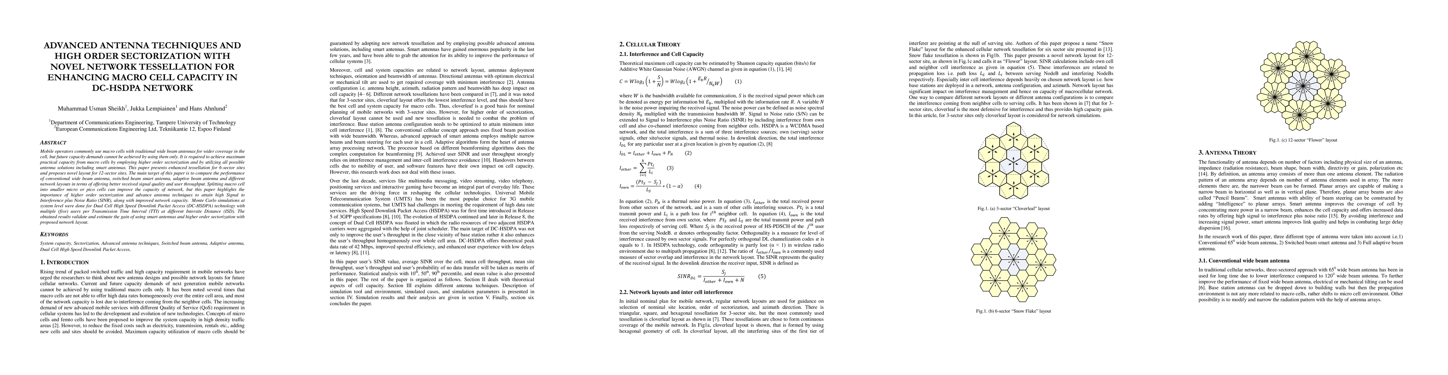 Mobile operators commonly use macro cells with traditional wide beam antennas for wider coverage in the cell, but future capacity demands cannot be achieved by using them only. It is required to achieve maximum practical capacity from macro cells by employing higher order sectorization and by utilizing all possible antenna solutions including smart antennas. This paper presents enhanced tessellation for 6-sector sites and proposes novel layout for 12-sector sites. The main target of this paper is to compare the performance of conventional wide beam antenna, switched beam smart antenna, adaptive beam antenna and different network layouts in terms of offering better received signal quality and user throughput. Splitting macro cell into smaller micro or pico cells can improve the capacity of network, but this paper highlights the importance of higher order sectorization and advance antenna techniques to attain high Signal to Interference plus Noise Ratio (SINR), along with improved network capacity. Monte Carlo simulations at system level were done for Dual Cell High Speed Downlink Packet Access (DC-HSDPA) technology with multiple (five) users per Transmission Time Interval (TTI) at different Intersite Distance (ISD). The obtained results validate and estimate the gain of using smart antennas and higher order sectorization with proposed network layout.