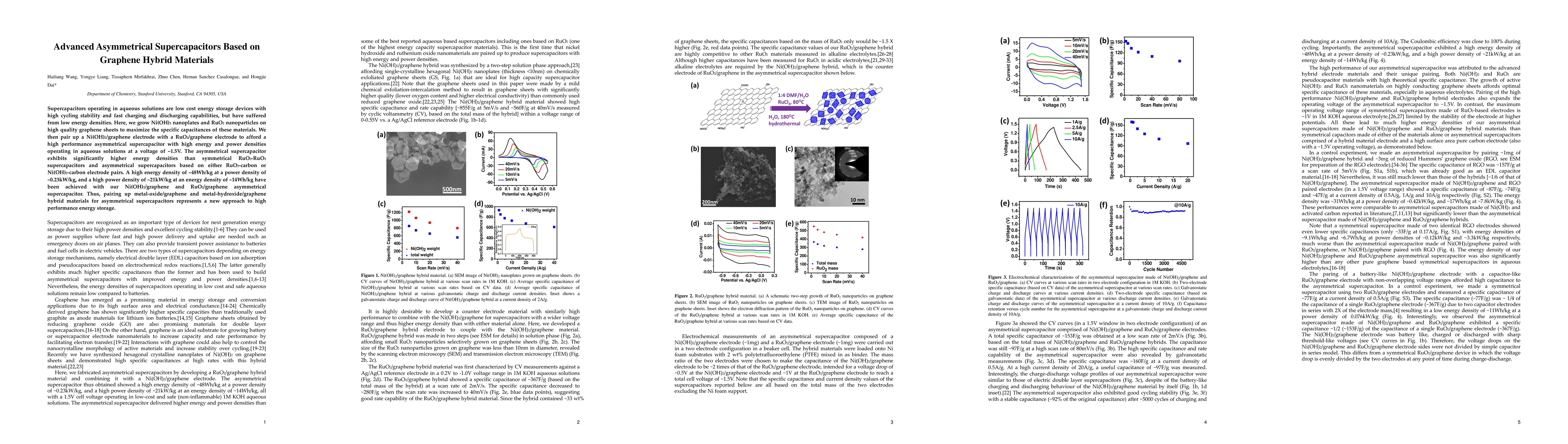 This paper presents an advanced asymmetrical supercapacitor utilizing graphene hybrid materials with Ni(OH)2 nanoplates and RuO2 nanoparticles, achieving high energy and power densities of 48Wh/kg and 21kW/kg respectively, outperforming conventional symmetrical and asymmetrical supercapacitors.