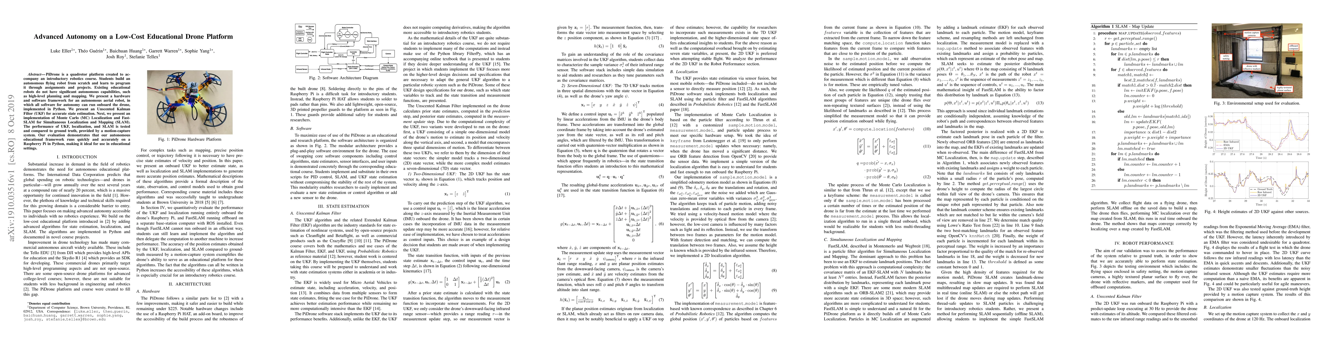 PiDrone is a quadrotor platform created to accompany an introductory robotics course. Students build an autonomous flying robot from scratch and learn to program it through assignments and projects. Existing educational robots do not have significant autonomous capabilities, such as high-level planning and mapping. We present a hardware and software framework for an autonomous aerial robot, in which all software for autonomy can run onboard the drone, implemented in Python. We present an Unscented Kalman Filter (UKF) for accurate state estimation. Next, we present an implementation of Monte Carlo (MC) Localization and FastSLAM for Simultaneous Localization and Mapping (SLAM). The performance of UKF, localization, and SLAM is tested and compared to ground truth, provided by a motion-capture system. Our evaluation demonstrates that our autonomous educational framework runs quickly and accurately on a Raspberry Pi in Python, making it ideal for use in educational settings.