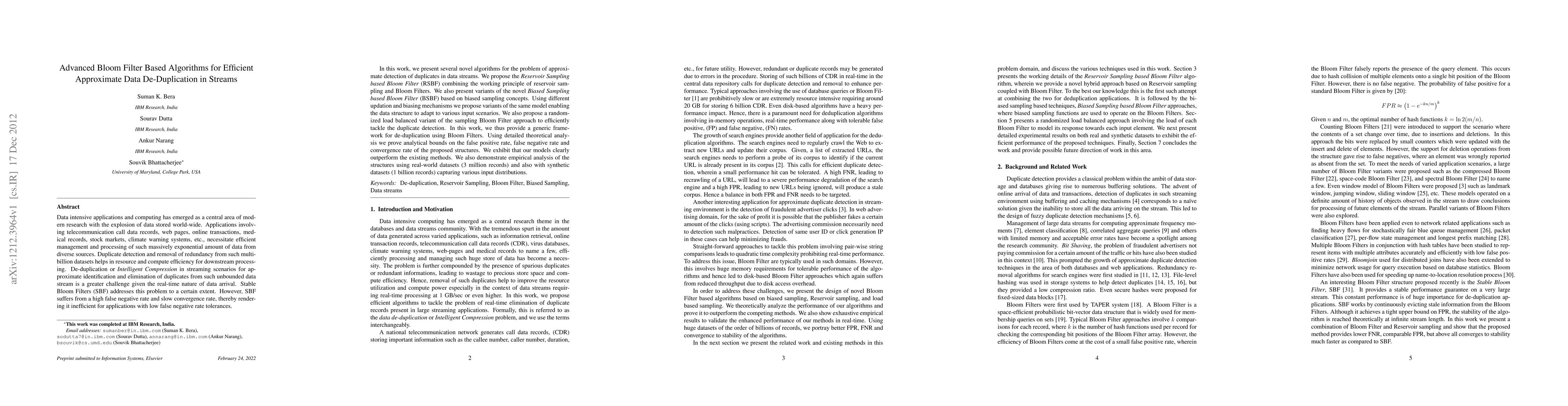 Applications involving telecommunication call data records, web pages, online transactions, medical records, stock markets, climate warning systems, etc., necessitate efficient management and processing of such massively exponential amount of data from diverse sources. De-duplication or Intelligent Compression in streaming scenarios for approximate identification and elimination of duplicates from such unbounded data stream is a greater challenge given the real-time nature of data arrival. Stable Bloom Filters (SBF) addresses this problem to a certain extent. . In this work, we present several novel algorithms for the problem of approximate detection of duplicates in data streams. We propose the Reservoir Sampling based Bloom Filter (RSBF) combining the working principle of reservoir sampling and Bloom Filters. We also present variants of the novel Biased Sampling based Bloom Filter (BSBF) based on biased sampling concepts. We also propose a randomized load balanced variant of the sampling Bloom Filter approach to efficiently tackle the duplicate detection. In this work, we thus provide a generic framework for de-duplication using Bloom Filters. Using detailed theoretical analysis we prove analytical bounds on the false positive rate, false negative rate and convergence rate of the proposed structures. We exhibit that our models clearly outperform the existing methods. We also demonstrate empirical analysis of the structures using real-world datasets (3 million records) and also with synthetic datasets (1 billion records) capturing various input distributions.
