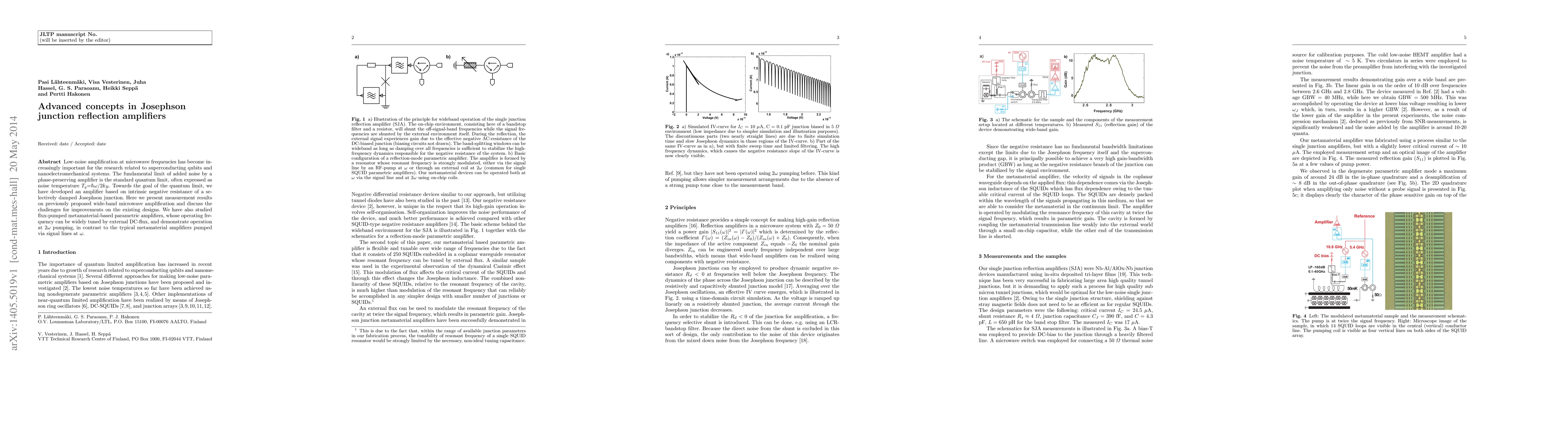 Low-noise amplification atmicrowave frequencies has become increasingly important for the research related to superconducting qubits and nanoelectromechanical systems. The fundamental limit of added noise by a phase-preserving amplifier is the standard quantum limit, often expressed as noise temperature $T_{q} = \hbar {\omega}/2k_{B}$. Towards the goal of the quantum limit, we have developed an amplifier based on intrinsic negative resistance of a selectively damped Josephson junction. Here we present measurement results on previously proposed wide-band microwave amplification and discuss the challenges for improvements on the existing designs. We have also studied flux-pumped metamaterial-based parametric amplifiers, whose operating frequency can be widely tuned by external DC-flux, and demonstrate operation at $2\omega$ pumping, in contrast to the typical metamaterial amplifiers pumped via signal lines at $\omega$.