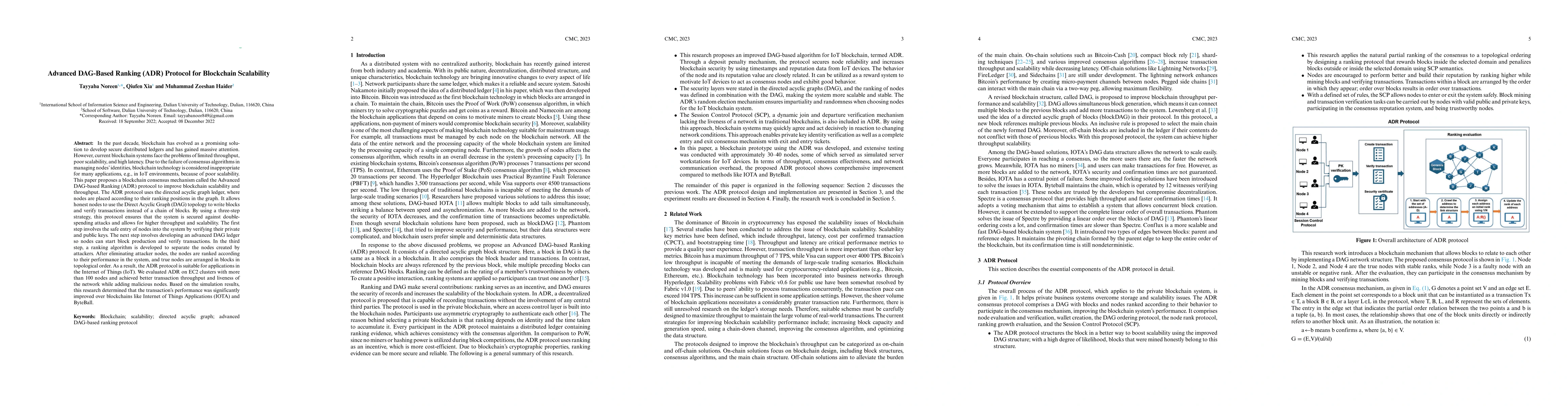 In the past decade, blockchain has emerged as a promising solution for building secure distributed ledgers and has attracted significant attention. However, current blockchain systems suffer from limited throughput, poor scalability, and high latency. Due to limitations in consensus mechanisms, especially in managing node identities, blockchain is often considered unsuitable for applications such as the Internet of Things (IoT). This paper proposes the Advanced DAG-based Ranking (ADR) protocol to enhance blockchain scalability and throughput. ADR employs a directed acyclic graph (DAG) structure where nodes are positioned based on their rankings. Unlike traditional chains, ADR allows honest nodes to write blocks and verify transactions using a DAG-based topology. The protocol follows a three-step approach to secure the network against double-spending and enhance performance. First, it verifies nodes using their public and private keys before granting entry. Second, it builds an advanced DAG ledger enabling block production and transaction validation. Third, a ranking algorithm filters out malicious nodes, ranks the remaining nodes based on performance, and arranges them topologically. This process increases throughput and ensures robust scalability. We evaluated ADR on Amazon EC2 clusters with over 100 nodes, including scenarios with injected malicious nodes. Simulation results demonstrate that ADR significantly improves transaction throughput and network liveness compared to existing DAG-based blockchains such as IOTA and ByteBall, making it well-suited for IoT applications.
