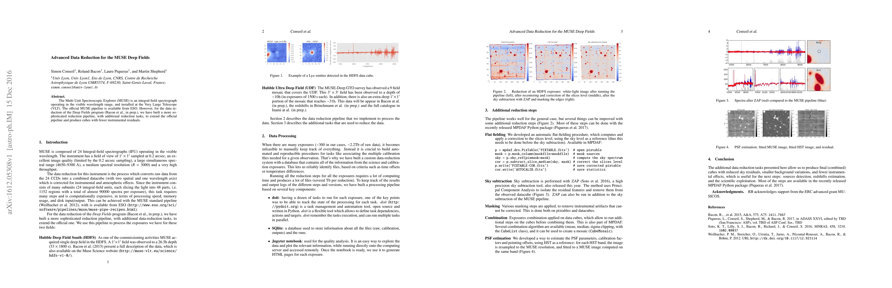 The Multi Unit Spectroscopic Explorer (MUSE) is an integral-field spectrograph operating in the visible wavelength range, and installed at the Very Large Telescope (VLT). The official MUSE pipeline is available from ESO. However, for the data reduction of the Deep Fields program (Bacon et al., in prep.), we have built a more sophisticated reduction pipeline, with additional reduction tasks, to extend the official pipeline and produce cubes with fewer instrumental residuals.