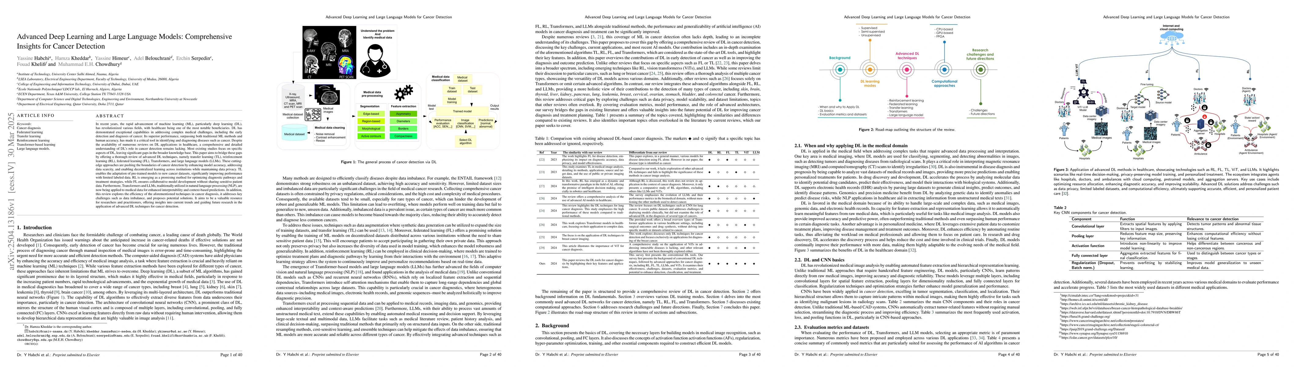 This paper conducts a comprehensive review of advanced deep learning techniques including transfer learning, reinforcement learning, federated learning, Transformers, and large language models for cancer detection.
