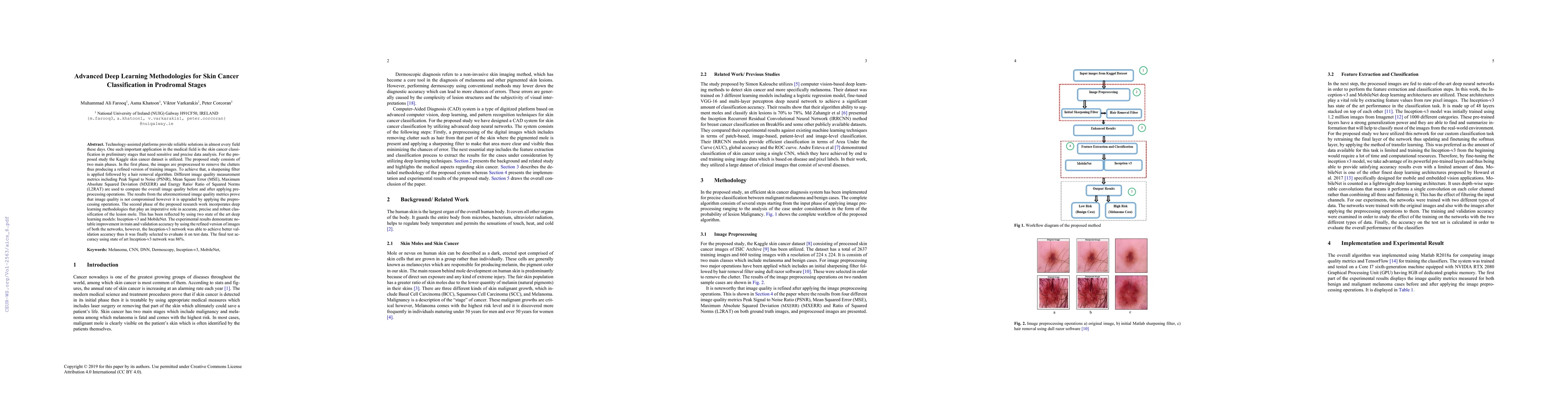 Technology-assisted platforms provide reliable solutions in almost every field these days. One such important application in the medical field is the skin cancer classification in preliminary stages that need sensitive and precise data analysis. For the proposed study the Kaggle skin cancer dataset is utilized. The proposed study consists of two main phases. In the first phase, the images are preprocessed to remove the clutters thus producing a refined version of training images. To achieve that, a sharpening filter is applied followed by a hair removal algorithm. Different image quality measurement metrics including Peak Signal to Noise (PSNR), Mean Square Error (MSE), Maximum Absolute Squared Deviation (MXERR) and Energy Ratio/ Ratio of Squared Norms (L2RAT) are used to compare the overall image quality before and after applying preprocessing operations. The results from the aforementioned image quality metrics prove that image quality is not compromised however it is upgraded by applying the preprocessing operations. The second phase of the proposed research work incorporates deep learning methodologies that play an imperative role in accurate, precise and robust classification of the lesion mole. This has been reflected by using two state of the art deep learning models: Inception-v3 and MobileNet. The experimental results demonstrate notable improvement in train and validation accuracy by using the refined version of images of both the networks, however, the Inception-v3 network was able to achieve better validation accuracy thus it was finally selected to evaluate it on test data. The final test accuracy using state of art Inception-v3 network was 86%.