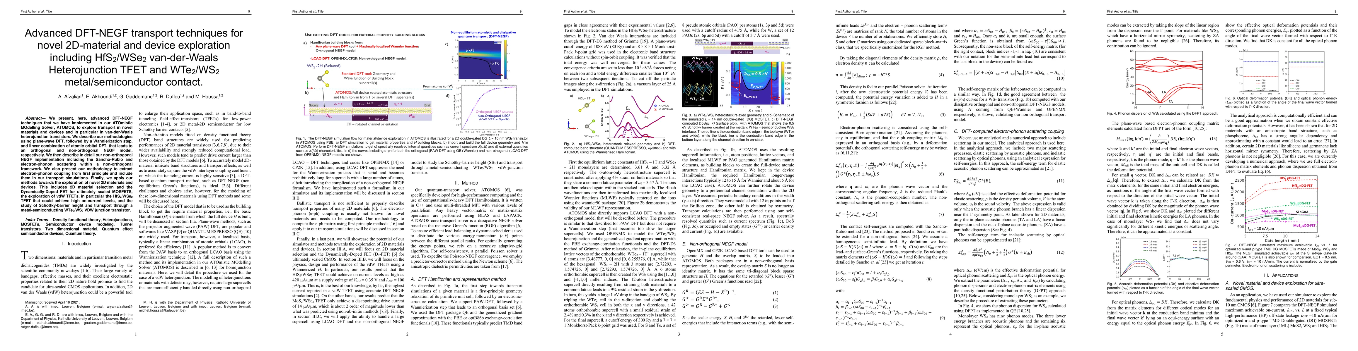 We present, here, advanced DFT-NEGF techniques that we have implemented in our ATOmistic MOdelling Solver, ATOMOS, to explore transport in novel materials and devices and in particular in van-der-Waals heterojunction transistors. We describe our methodologies using plane-wave DFT, followed by a Wannierization step, and linear combination of atomic orbital DFT, that leads to an orthogonal and non-orthogonal NEGF model, respectively. We then describe in detail our non-orthogonal NEGF implementation including the Sancho-Rubio and electron-phonon scattering within a non-orthogonal framework. We also present our methodology to extract electron-phonon coupling from first principle and include them in our transport simulations. Finally, we apply our methods towards the exploration of novel 2D materials and devices. This includes 2D material selection and the Dynamically-Doped FET for ultimately scaled MOSFETS, the exploration of vdW TFETs, in particular the HfS2/WSe2 TFET that could achieve high on-current levels, and the study of Schottky-barrier height and transport through a metal-semiconducting WTe2/WS2 VDW junction transistor.