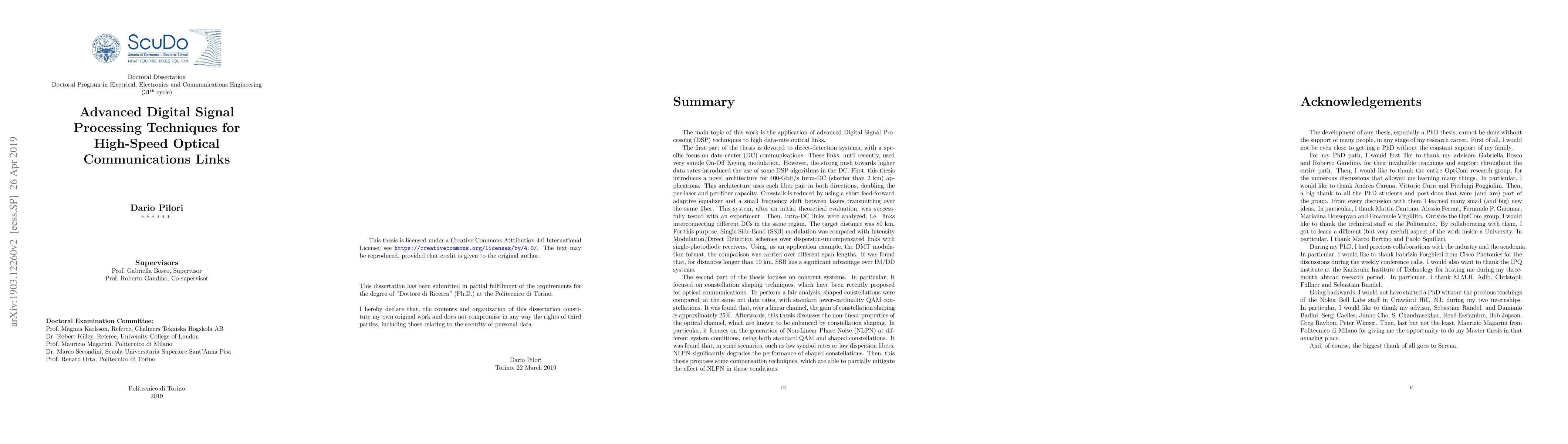 This paper explores advanced DSP techniques for high-speed optical communication, focusing on Direct-Detection systems with a novel bi-directional architecture for short links and self-coherent single-sideband transmission for long links, and Coherent systems utilizing Probabilistic Constellation Shaping for long-haul performance.