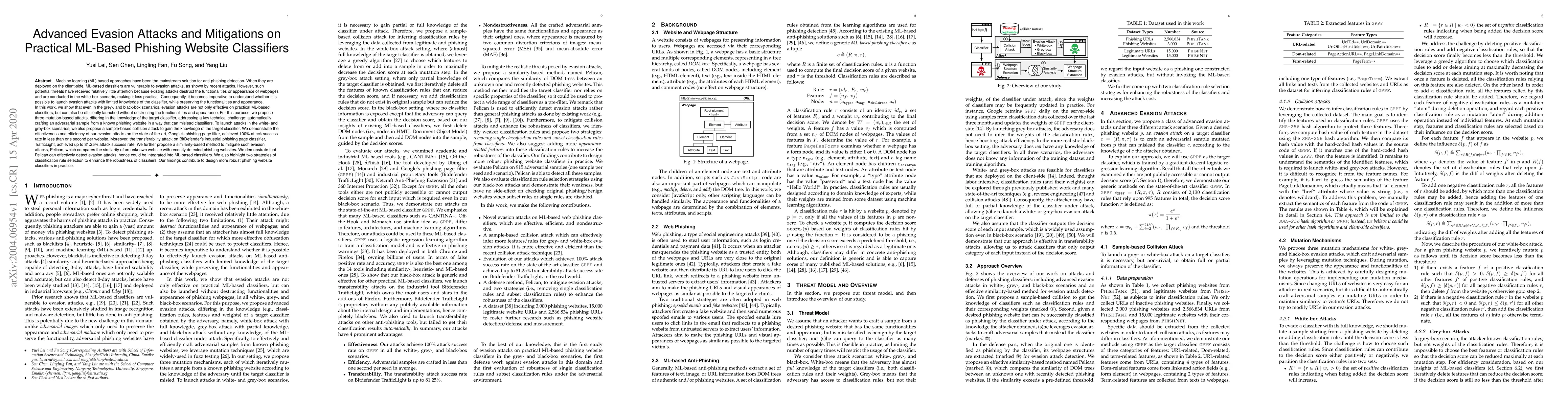 This paper investigates the effectiveness of evasion attacks on practical ML-based phishing website classifiers, demonstrating successful attacks in grey- and black-box scenarios without disrupting website functionalities. It proposes three mutation-based attacks and a sample-based collision attack, achieving 100% success rate on Google's filter and 81.25% on BitDefender's TrafficLight. A mitigation method, Pelican, is also introduced to detect such attacks.