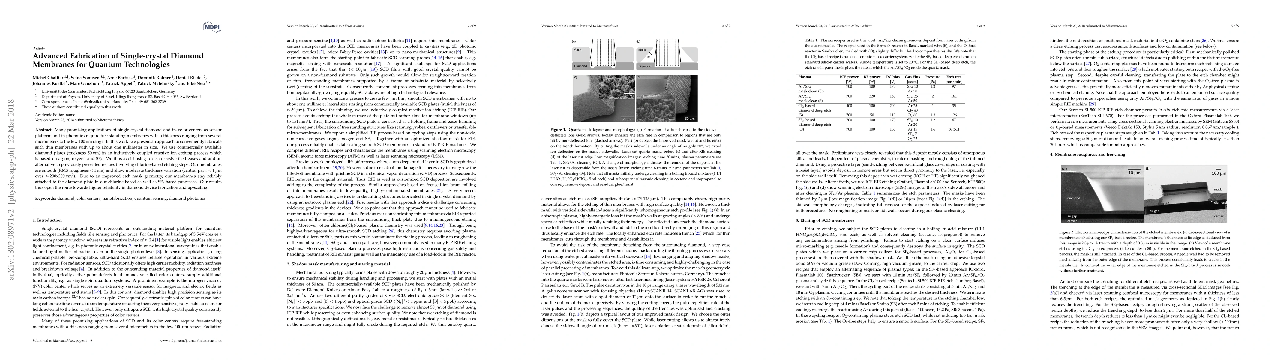 This paper details a novel fabrication method for thin, single-crystal diamond membranes using inductively coupled reactive ion etching, avoiding toxic gases and achieving smooth, reliable membranes essential for quantum technology applications. The new etch mask geometry ensures membrane adhesion, enhancing reliability and scalability in diamond device fabrication.